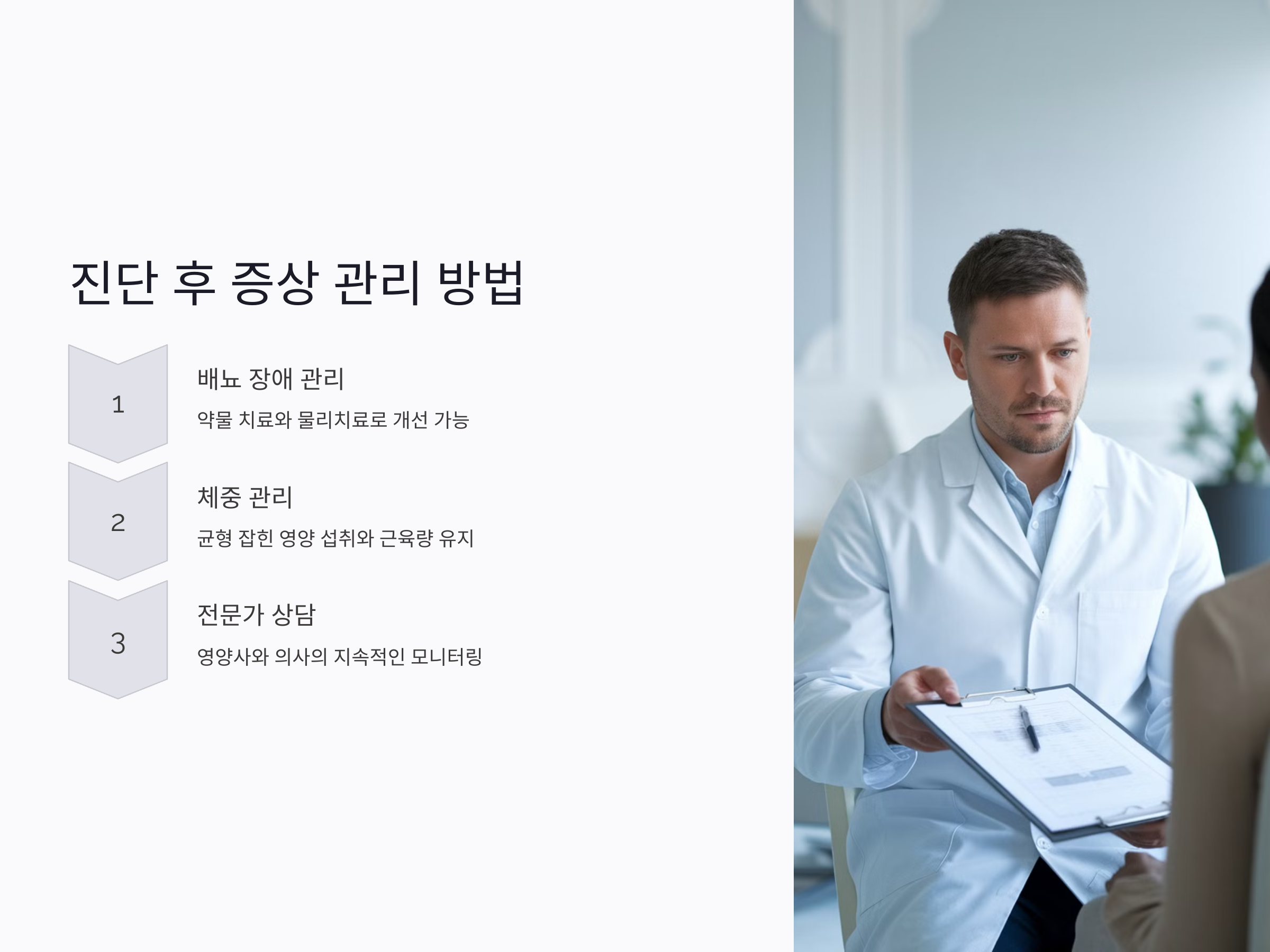 전립선암 진단을 받았다면, 배뇨 장애와 체중 감소를 어떻게 관리할 것인지에 대해 미리 준비하는 것이 중요합니다. 배뇨 장애는 일반적으로 약물 치료나 수술을 통해 관리할 수 있습니다. 또한, 체중 감소는 영양 상태를 개선하는 방법으로 해결할 수 있으며, 치료와 병행하면 좋은 효과를 볼 수 있습니다.