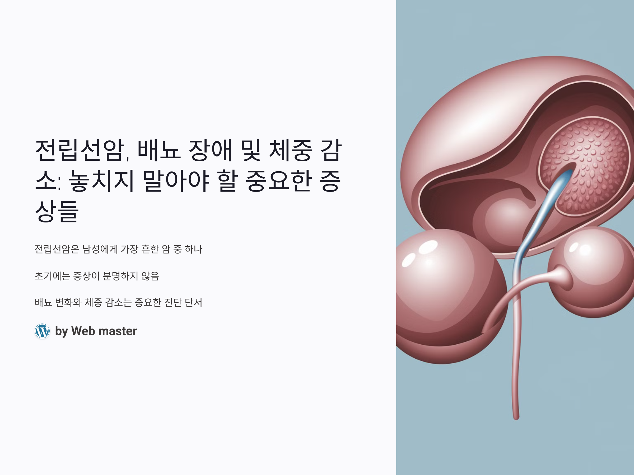 전립선암은 배뇨 장애와 체중 감소를 유발할 수 있는 중요한 질병입니다. 이러한 증상이 나타난다면 즉시 전문의와 상담하여 조기에 진단하고 치료를 받는 것이 중요합니다. 치료와 관리가 적절하게 이루어지면, 배