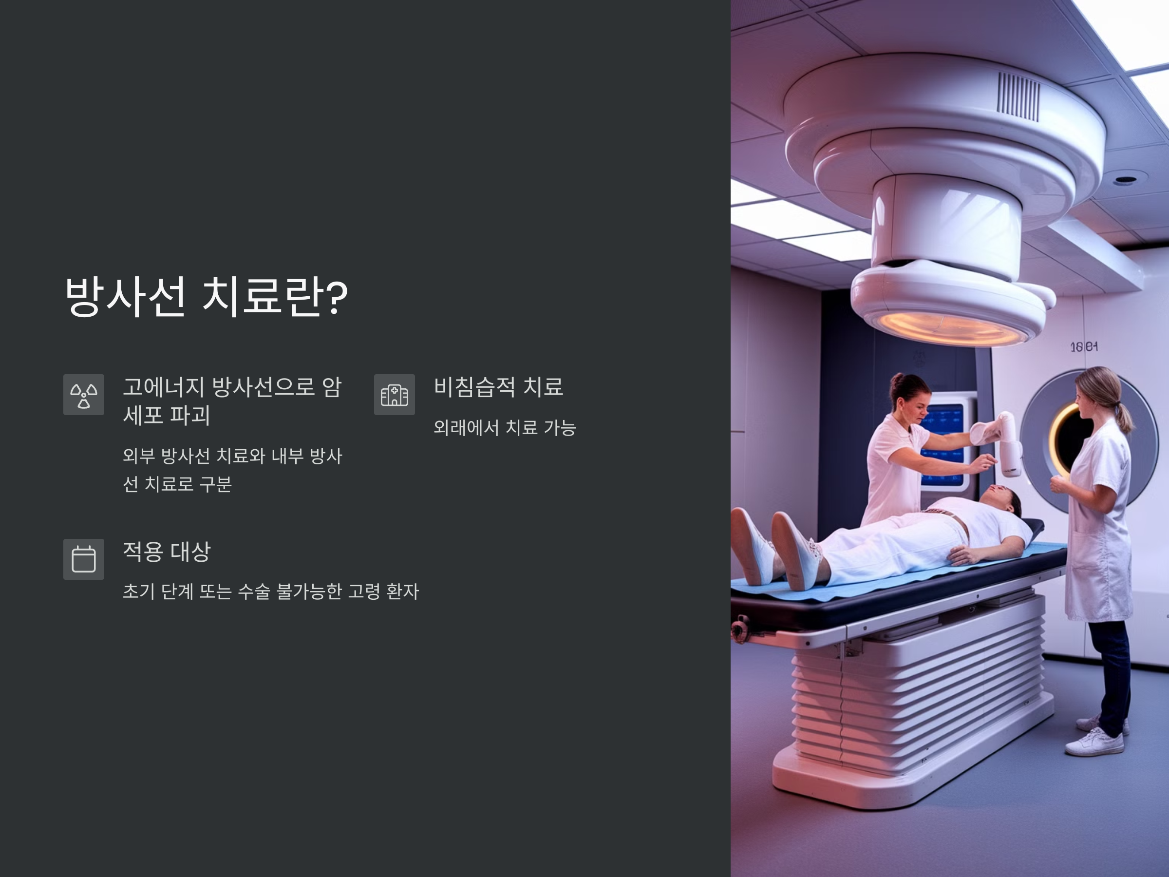방사선 치료는 전립선암의 초기 단계에서, 또는 수술 후 재발을 방지하기 위해 사용됩니다. 또한, 전립선 절제술을 받을 수 없는 고령의 환자나, 건강 상태가 좋지 않은 환자에게 선택될 수 있습니다. 방사선 치료의 주요 장점은 수술에 비해 회복 시간이 빠르다는 점입니다. 하지만, 일부 환자는 방사선 치료 후 배뇨나 성기능 문제 등의 부작용을 겪을 수 있습니다.