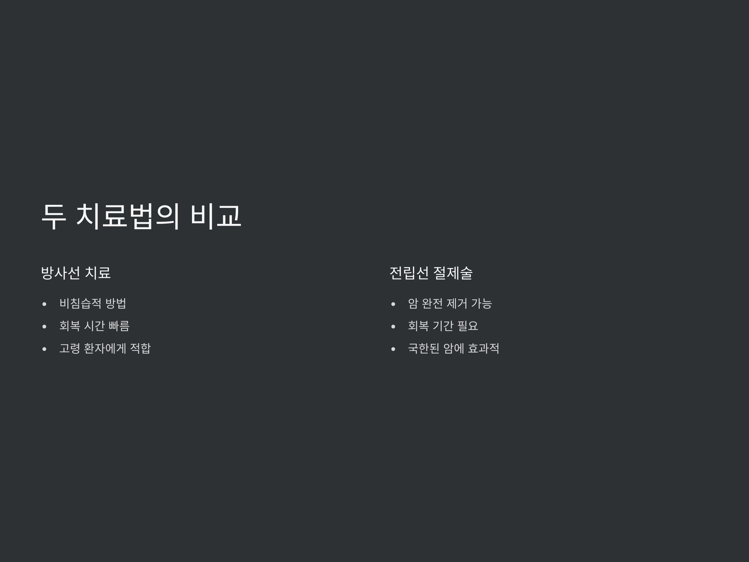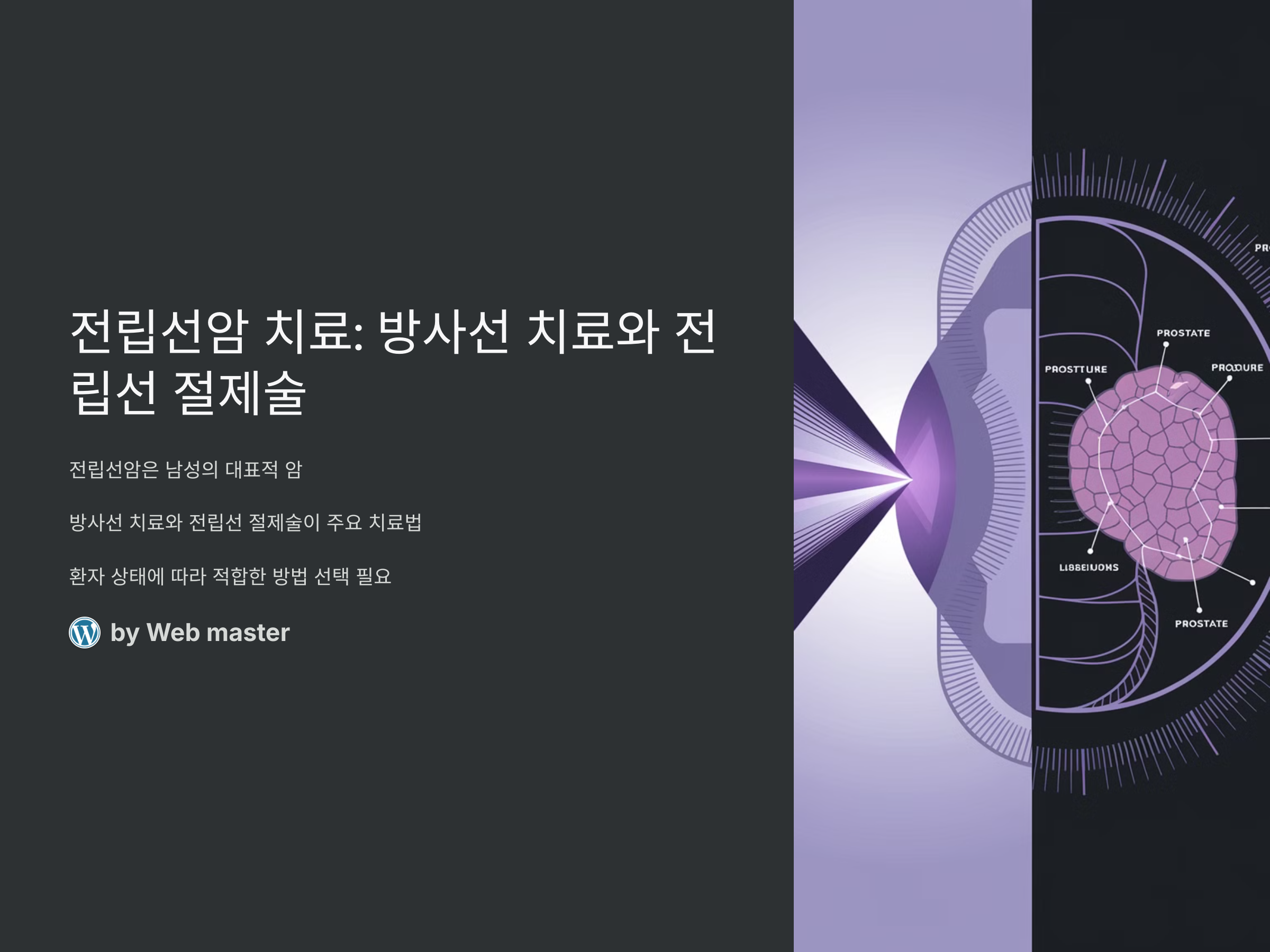 전립선암의 치료 방법으로 방사선 치료와 전립선 절제술은 각각의 특성과 장단점이 있습니다. 방사선 치료는 비침습적이며 회복 시간이 짧은 장점이 있지만, 일부 환자에게 부작용이 있을 수 있습니다. 전립선 절제술은 암을 완전히 제거할 수 있는 방법으로, 수술 후 회복과 관리가 중요합니다. 환자의 상태에 맞는 치료 방법을 선택하는 것이 중요하며, 반드시 전문가의 상담을 통해 결정을 내려야 합니다.