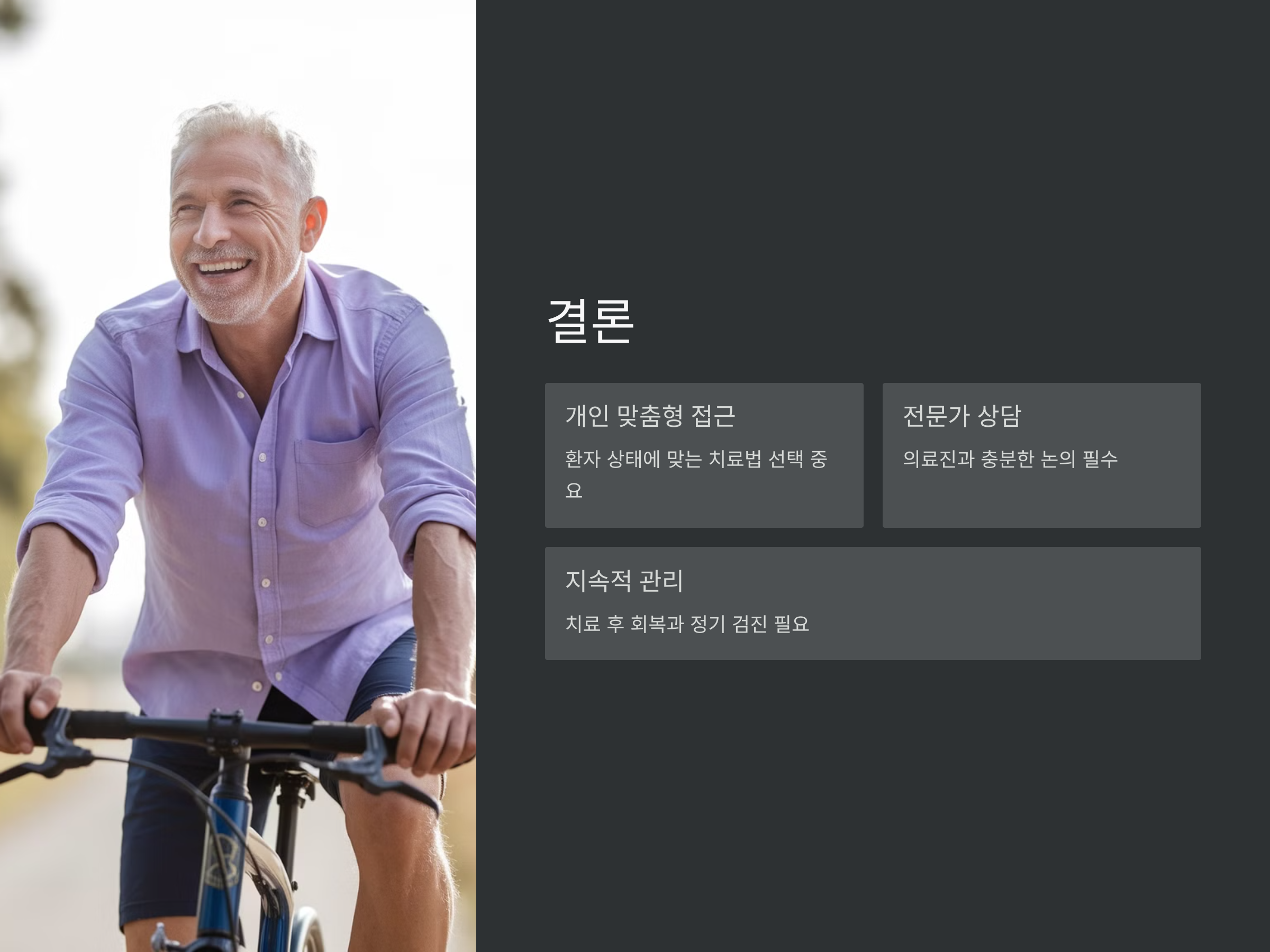 전립선암의 치료는 치료 후 회복과 관리가 중요한 만큼, 각 치료법의 특징과 치료 후 관리에 대한 충분한 이해가 필요합니다. 최신 치료 방법과 기술을 활용하여, 전립선암을 보다 효과적으로 치료할 수 있는 시대가 오고 있습니다. 환자 개개인에 맞는 최적의 치료를 선택하여, 건강한 삶을 지속할 수 있도록 노력해야 합니다.