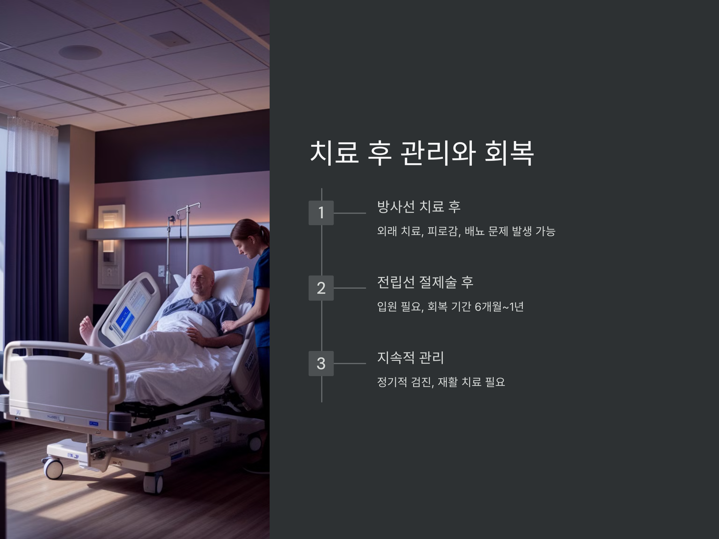방사선 치료와 전립선 절제술은 각각 치료 후 관리와 회복에 있어 차이가 있습니다. 방사선 치료 후에는 대부분의 환자가 입원하지 않고 외래에서 치료를 받습니다. 치료 후에는 피로감이나 배뇨 문제, 성기능 문제가 발생할 수 있습니다. 이러한 증상들은 시간이 지나면서 호전되지만, 일부 환자에게는 지속적으로 영향을 미칠 수 있습니다.