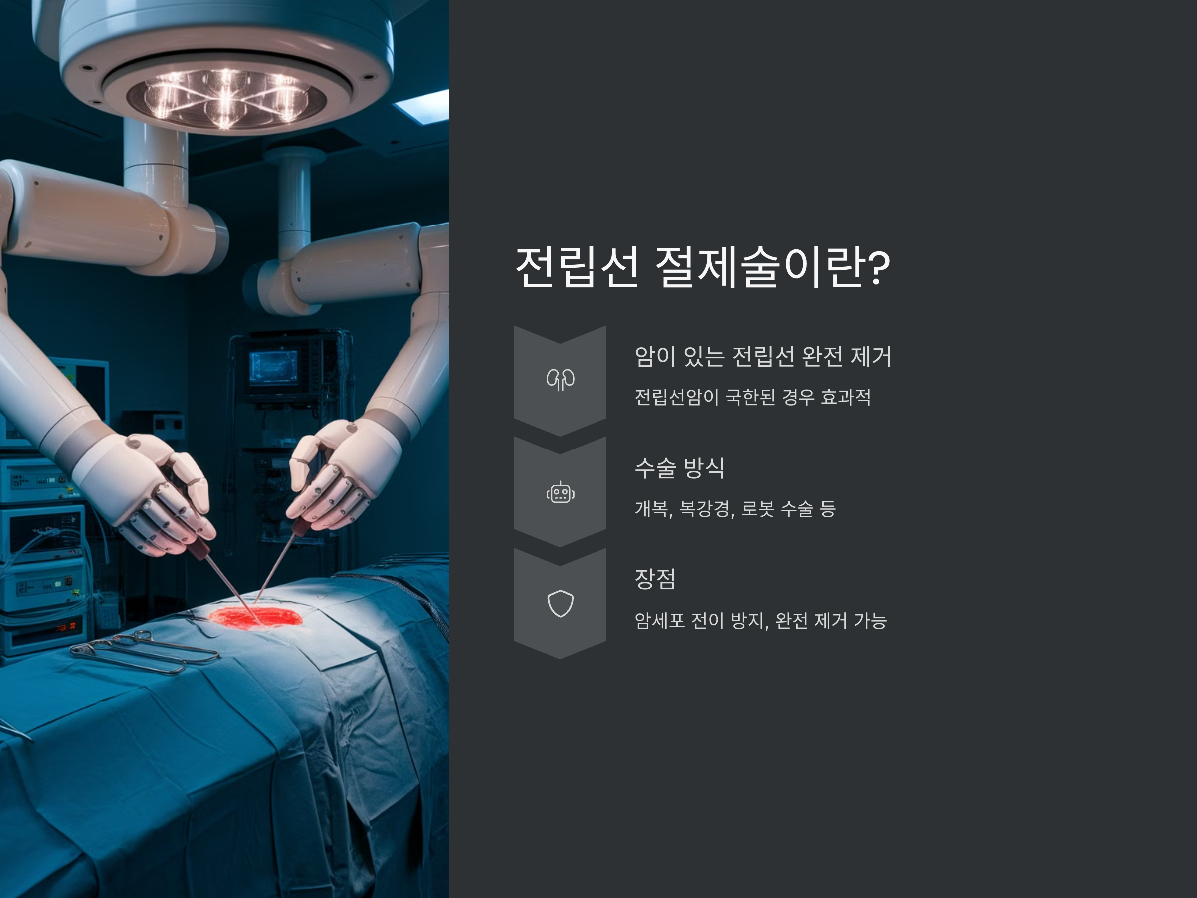 전립선 절제술은 암이 있는 전립선을 수술을 통해 완전히 제거하는 방법입니다. 이 수술은 전립선암이 전립선에 국한되어 있을 때 가장 효과적이며, 수술을 통해 암이 있는 부위를 완전히 제거함으로써 암의 전이를 막을 수 있습니다.