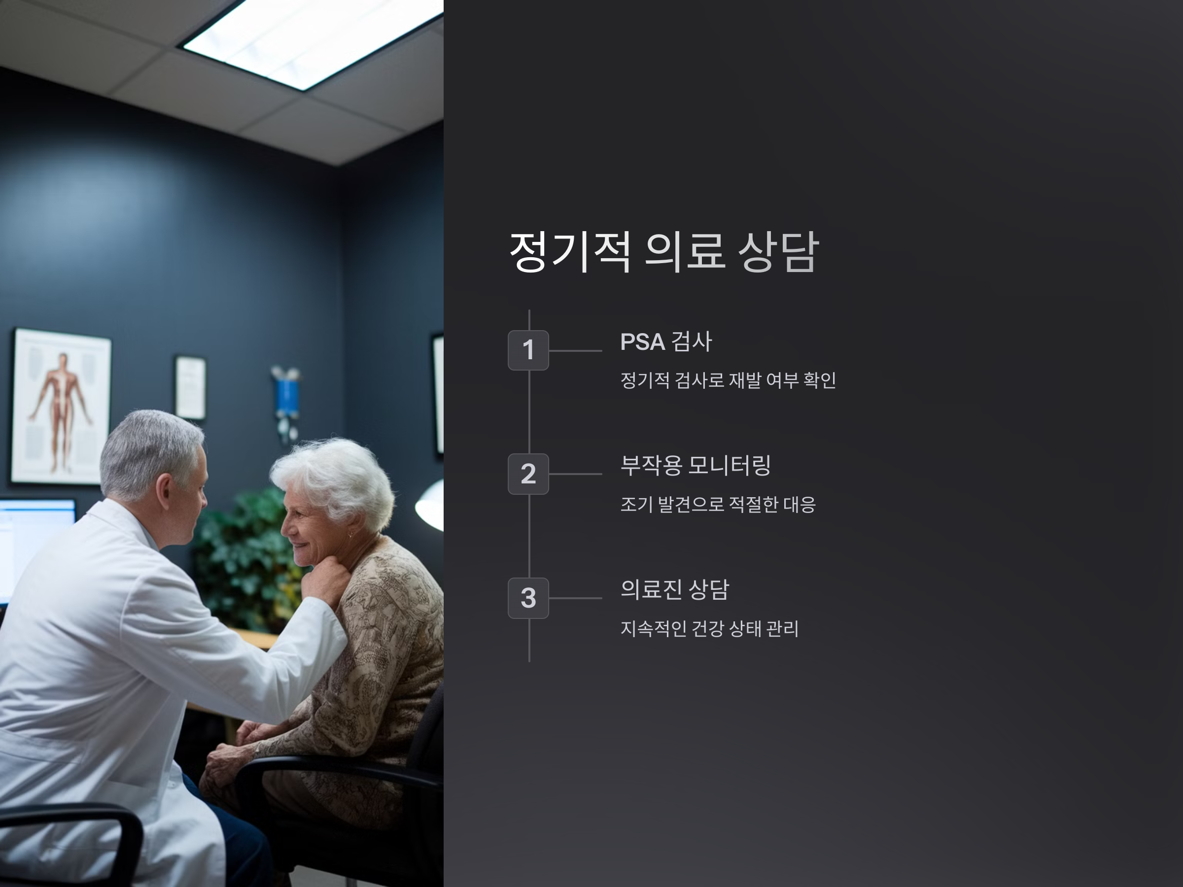전립선암 치료 후에는 정기적인 의료 상담과 추적 관찰이 필수적입니다. 이는 재발 여부를 확인하고, 치료로 인한 부작용을 조기에 발견하여 적절히 대응하기 위함입니다. 정기적인 PSA 검사와 의료진과의 상담을 통해 건강 상태를 지속적으로 모니터링해야 합니다.