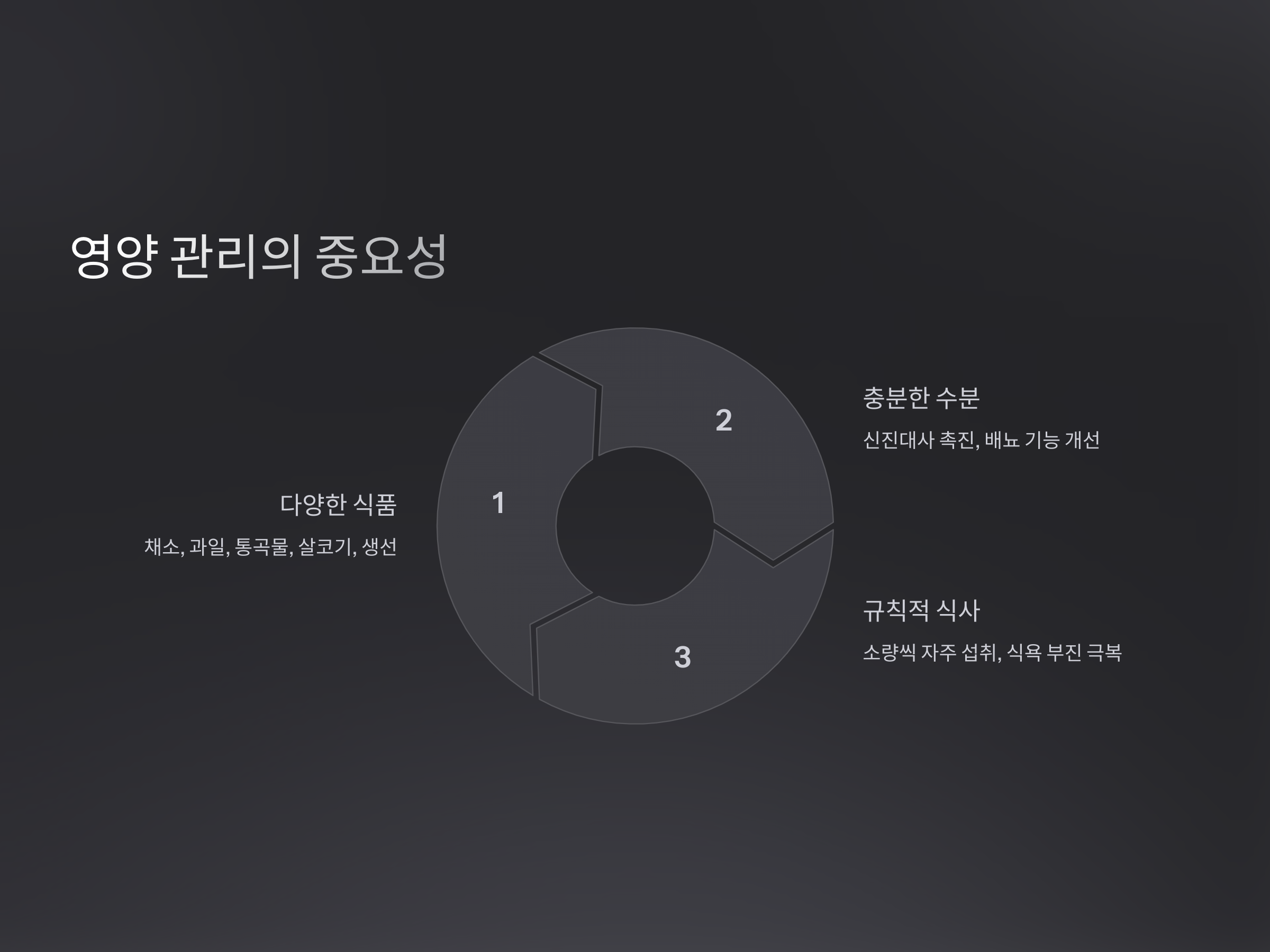 - 식사 패턴 유지: 규칙적인 식사 시간을 지키고, 소량씩 자주 섭취하여 식욕 부진을 극복합니다.