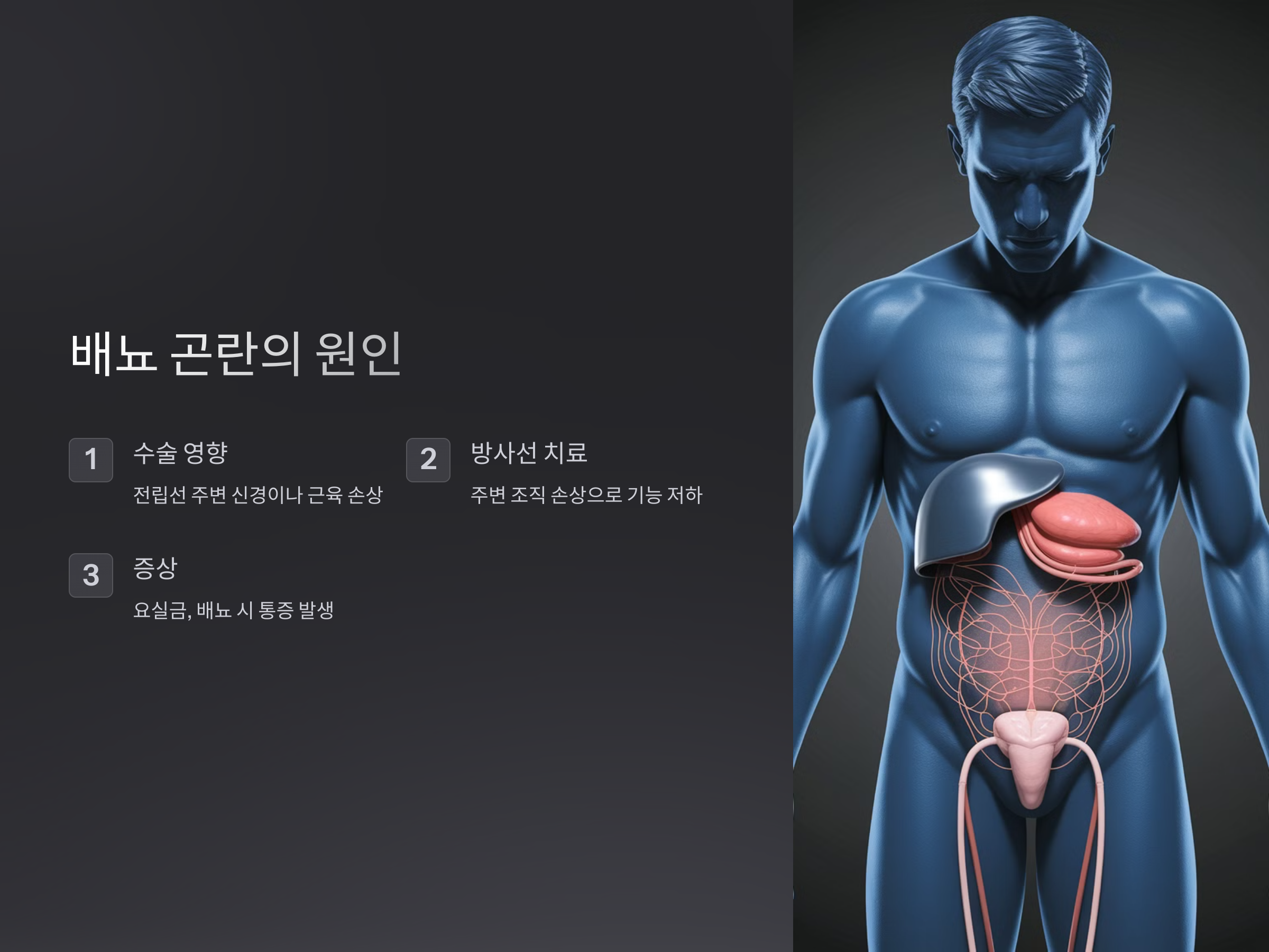 전립선암 치료 후 배뇨 곤란은 수술이나 방사선 치료로 인해 발생할 수 있습니다. 이러한 치료 과정에서 전립선 주변의 신경이나 근육이 손상되어 배뇨 기능에 영향을 줄 수 있습니다. 특히 요실금이나 배뇨 시 통증 등의 증상이 나타날 수 있습니다. 이러한 증상은 일시적일 수 있지만, 일부 환자에서는 장기적으로 지속될 수 있으므로 주의가 필요합니다.