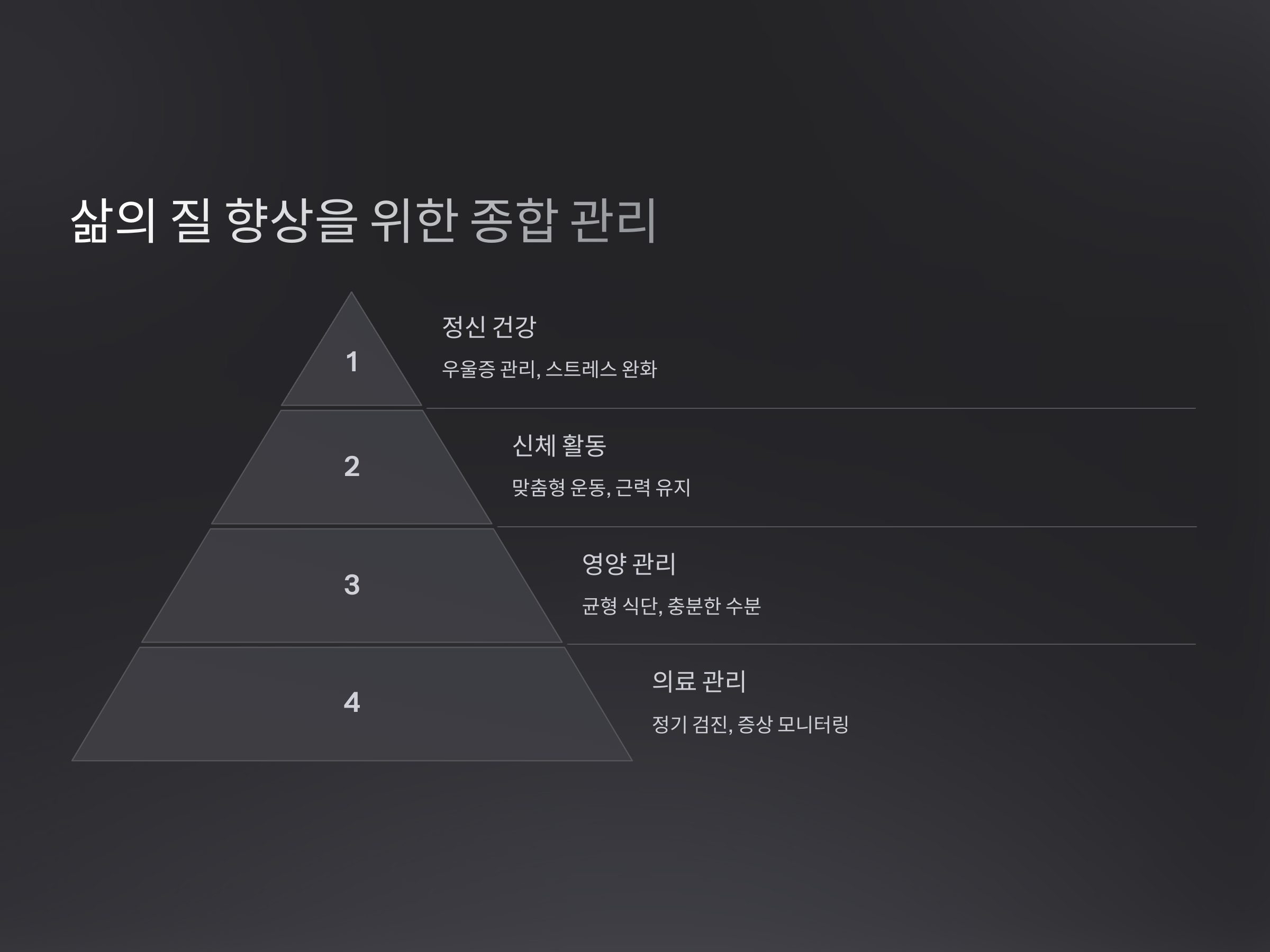 - 규칙적인 운동: 근력 운동과 유산소 운동을 병행하여 근육량을 유지하고 체력을 향상시킵니다. 이는 체중 감소를 방지하고 전반적인 건강을 개선하는 데 도움이 됩니다.