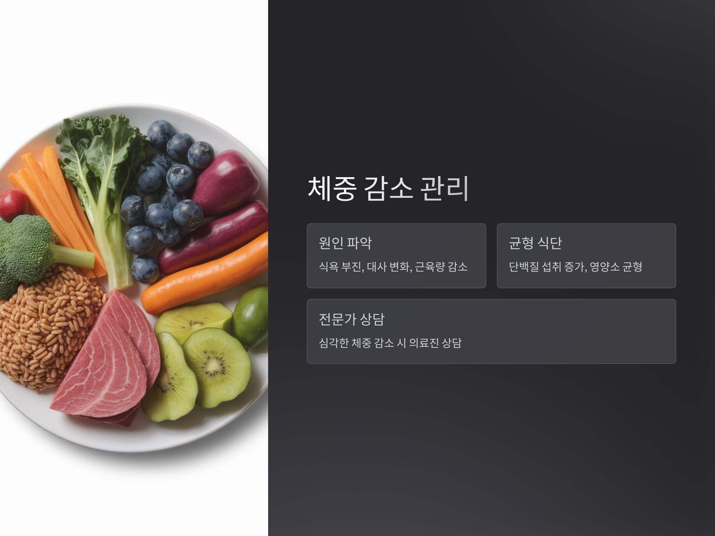 - 전문가 상담: 체중 감소가 심각하거나 지속될 경우, 의료 전문가와 상담하여 적절한 영양 관리와 치료를 받는 것이 중요합니다.