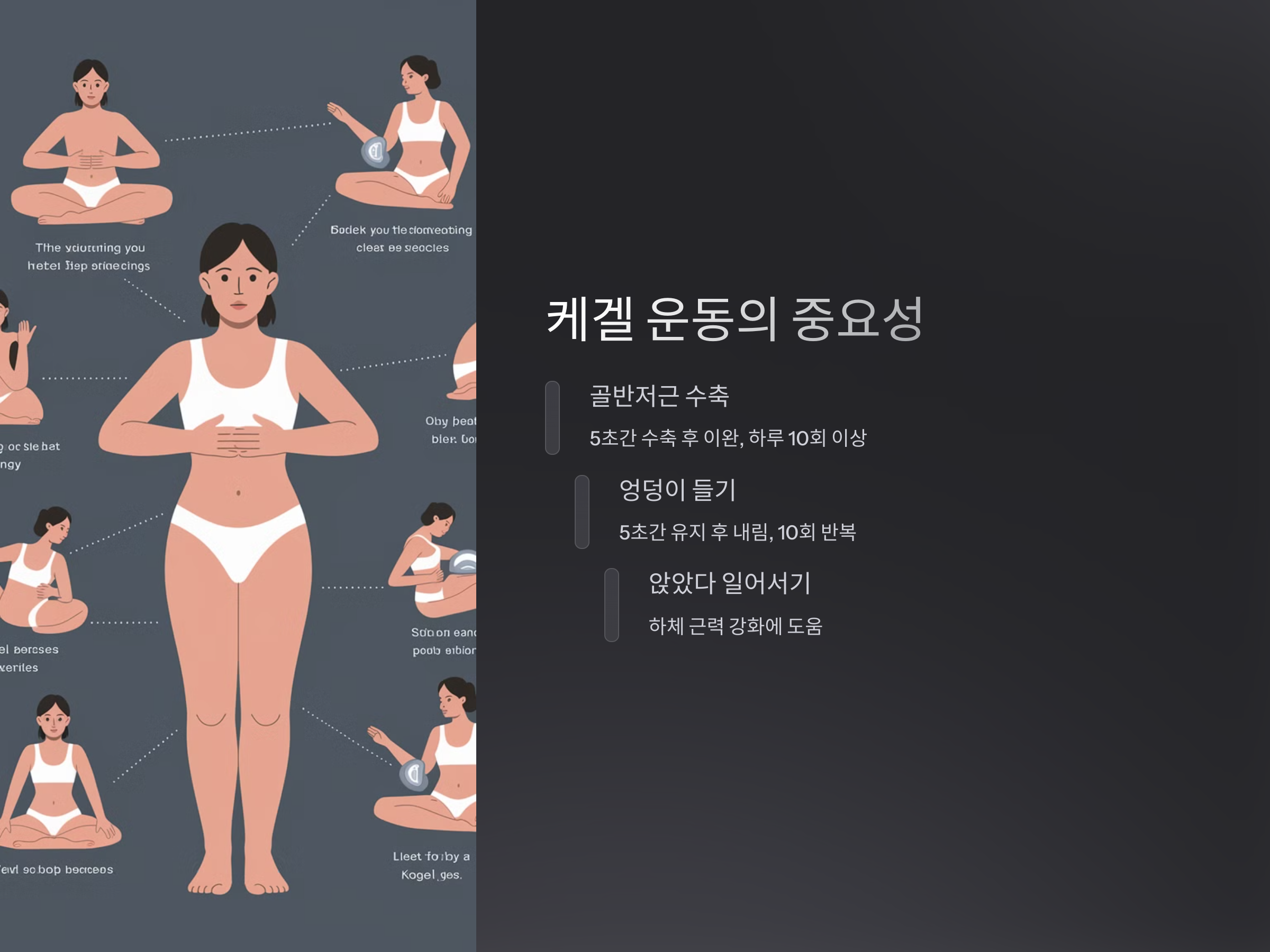 - 골반저근 수축하기: 골반저근을 5초간 수축한 후 이완합니다. 이 과정을 하루에 10회 이상 반복합니다.