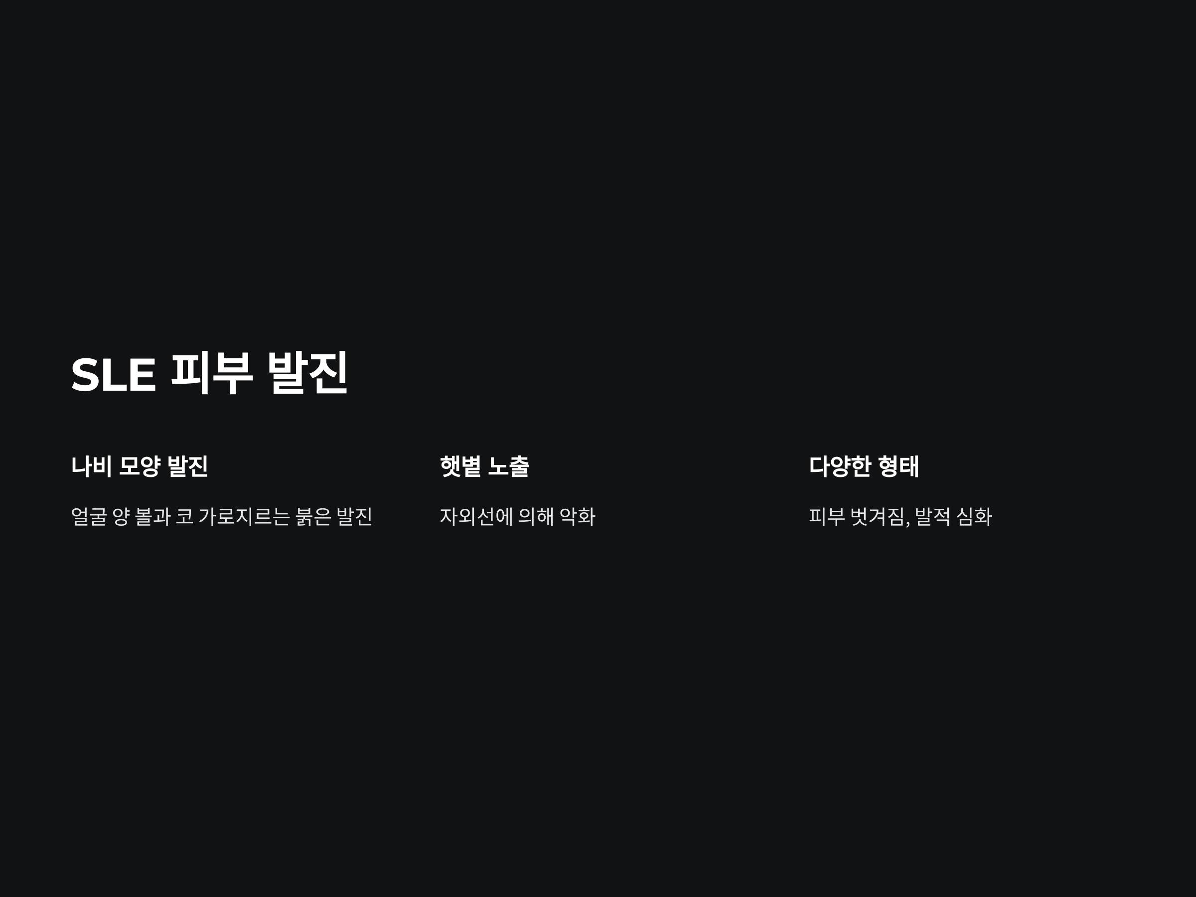 발진 외에도 다양한 형태의 피부 증상이 발생할 수 있습니다. 예를 들어, 피부가 벗겨지거나, 발적이 심해지는 등의 변화가 일어날 수 있습니다. 피부 발진은 단순히 미용적인 문제가 아니라, SLE가 진행되는 경고 신호일 수 있기 때문에 이를 무시하면 안 됩니다.