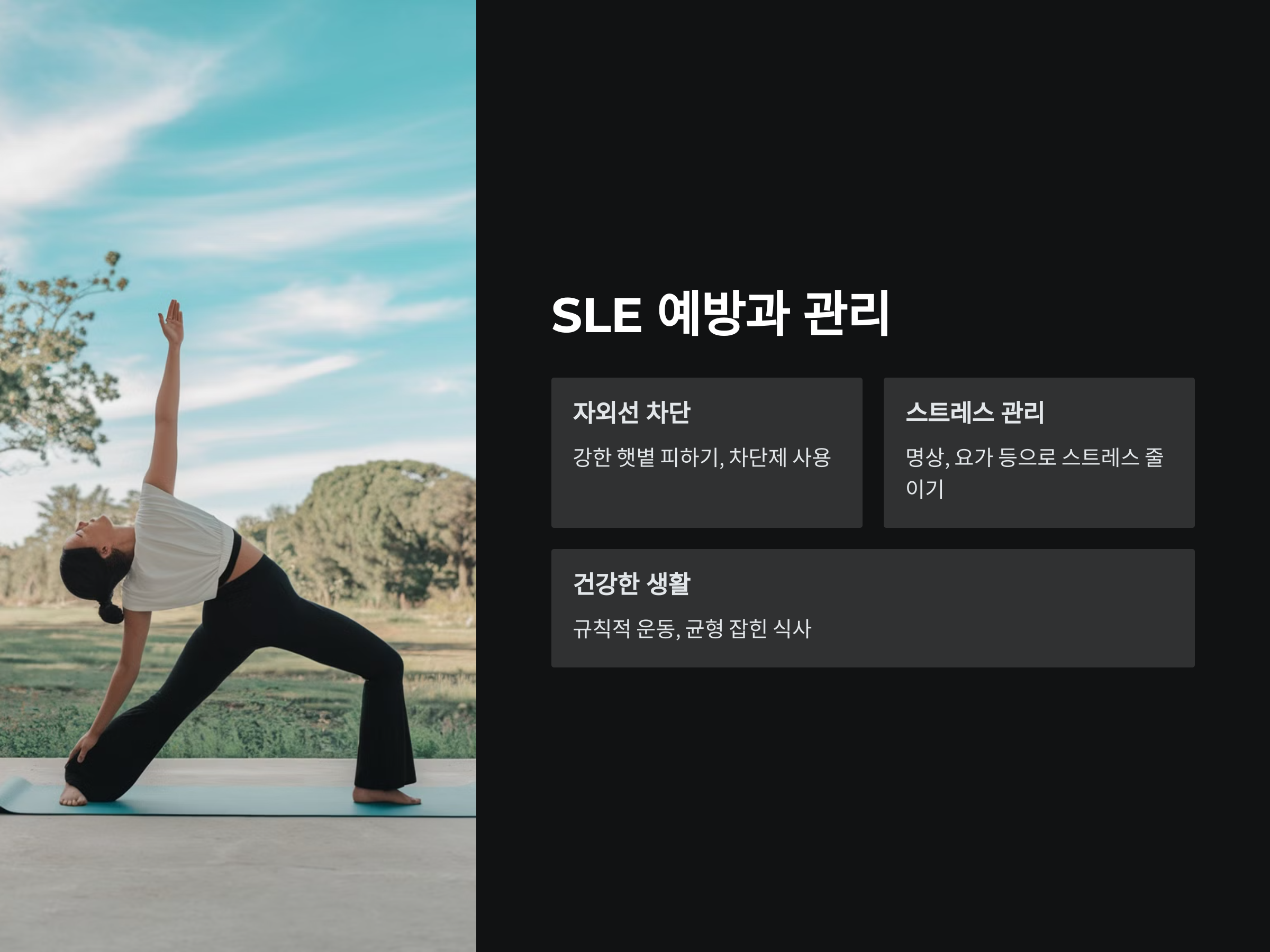 또한, 스트레스를 관리하고, 규칙적인 운동과 균형 잡힌 식사를 하는 것도 도움이 됩니다. 특히, 스트레스가 SLE의 증상을 유발하거나 악화시킬 수 있기 때문에, 명상이나 요가 등으로 스트레스를 줄이는 것도 좋은 방법입니다.