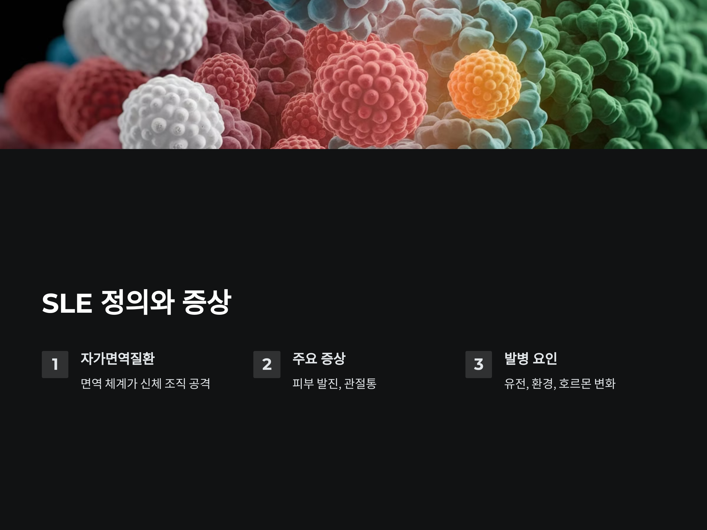 전신 홍반성 루푸스(SLE)는 면역 체계가 정상적으로 작동하지 않아 신체의 여러 조직과 기관을 공격하는 자가면역질환입니다. 이 질환은 주로 여성에게 많이 발생하며, 다양한 증상으로 나타납니다. 특히 피부 발진과 관절통이 주요 증상으로 나타나는데, 이로 인해 많은 사람들이 질병을 의심하지 않고 방치하는 경우가 많습니다.