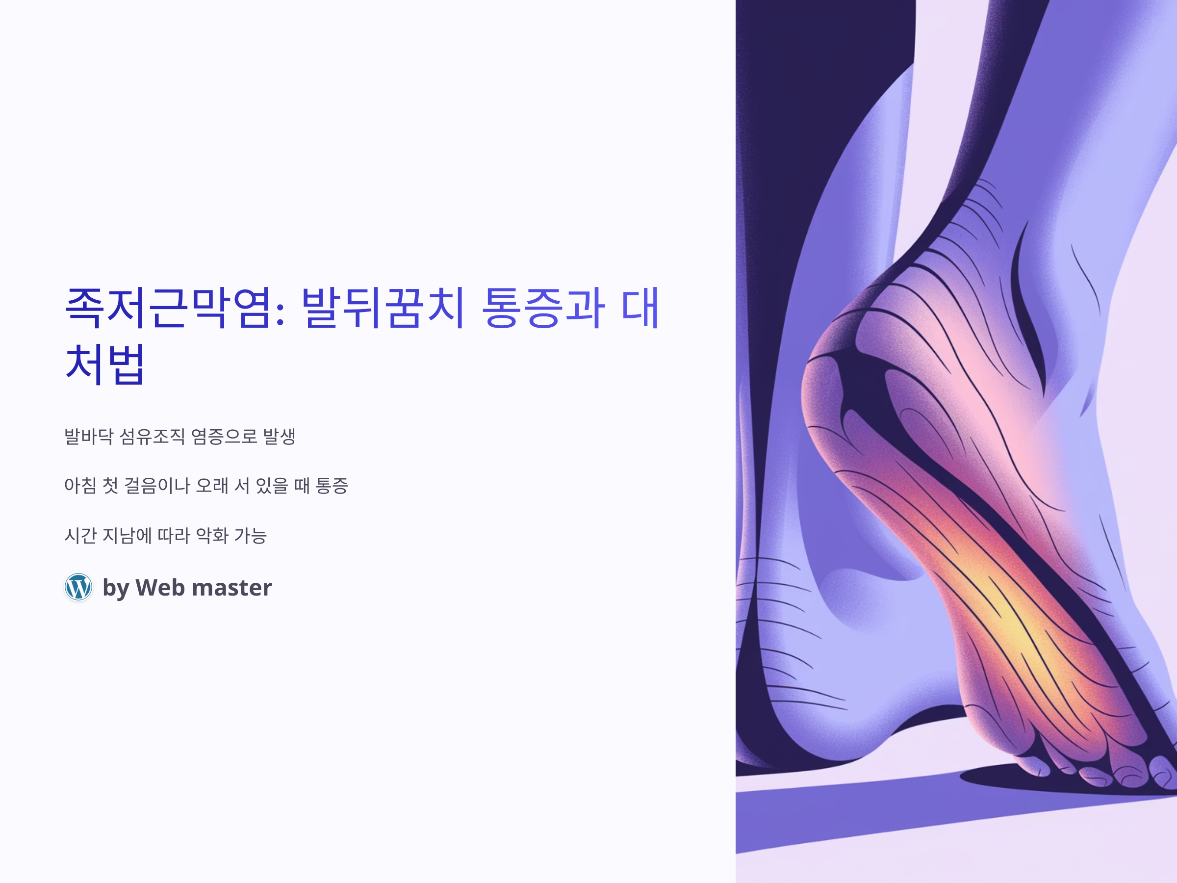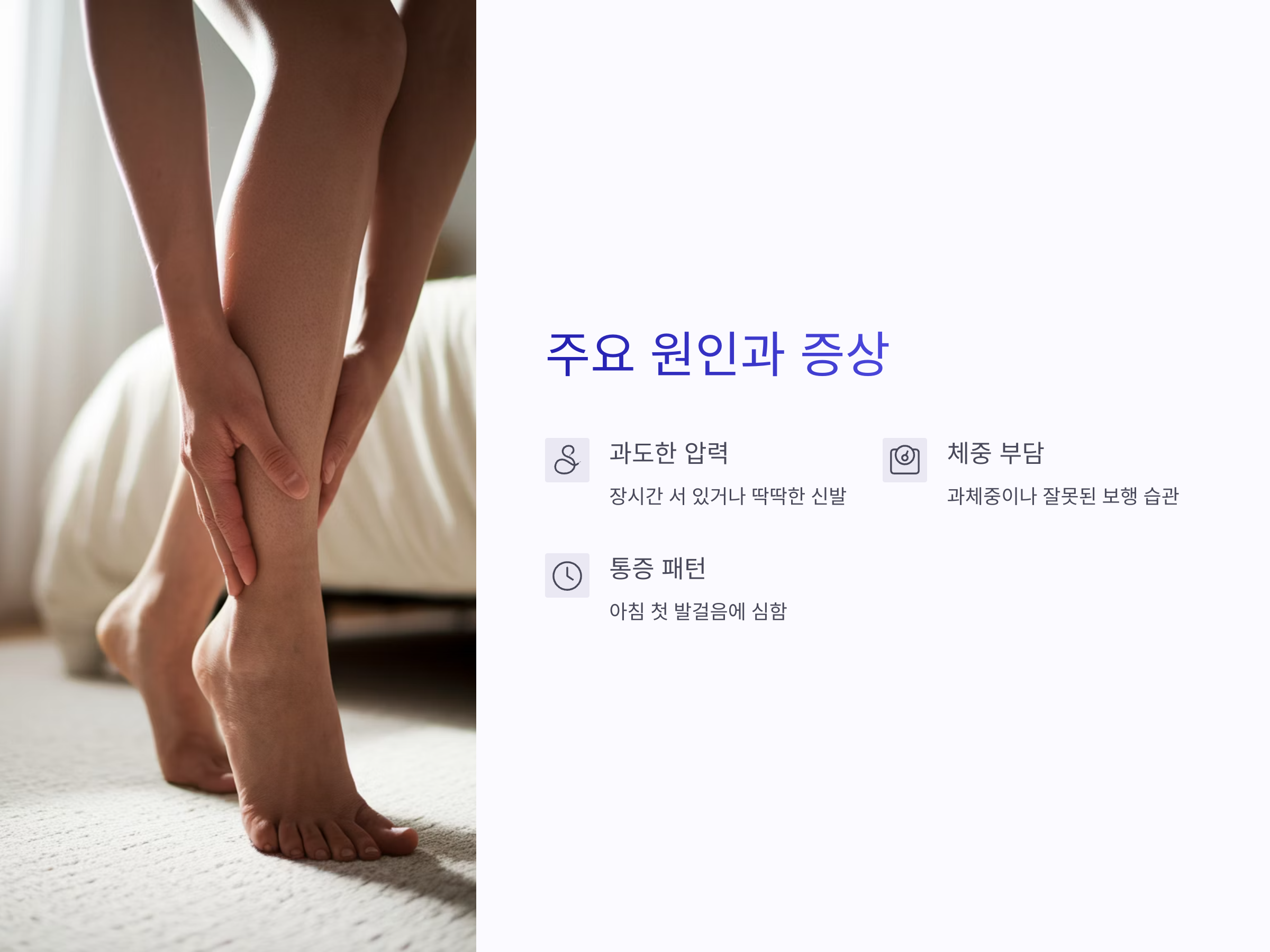 가장 흔한 증상은 발뒤꿈치 부위의 통증과 뻣뻣함으로, 특히 아침에 일어나 처음 발을 디딜 때 가장 심합니다. 이 통증은 시간이 지나면서 조금씩 완화되기도 하지만, 장시간 걷거나 서 있으면 다시 악화될 수 있습니다. 그 외에도 발바닥에 뜨거운 느낌이나 뻣뻣한 감각이 동반되기도 합니다.
