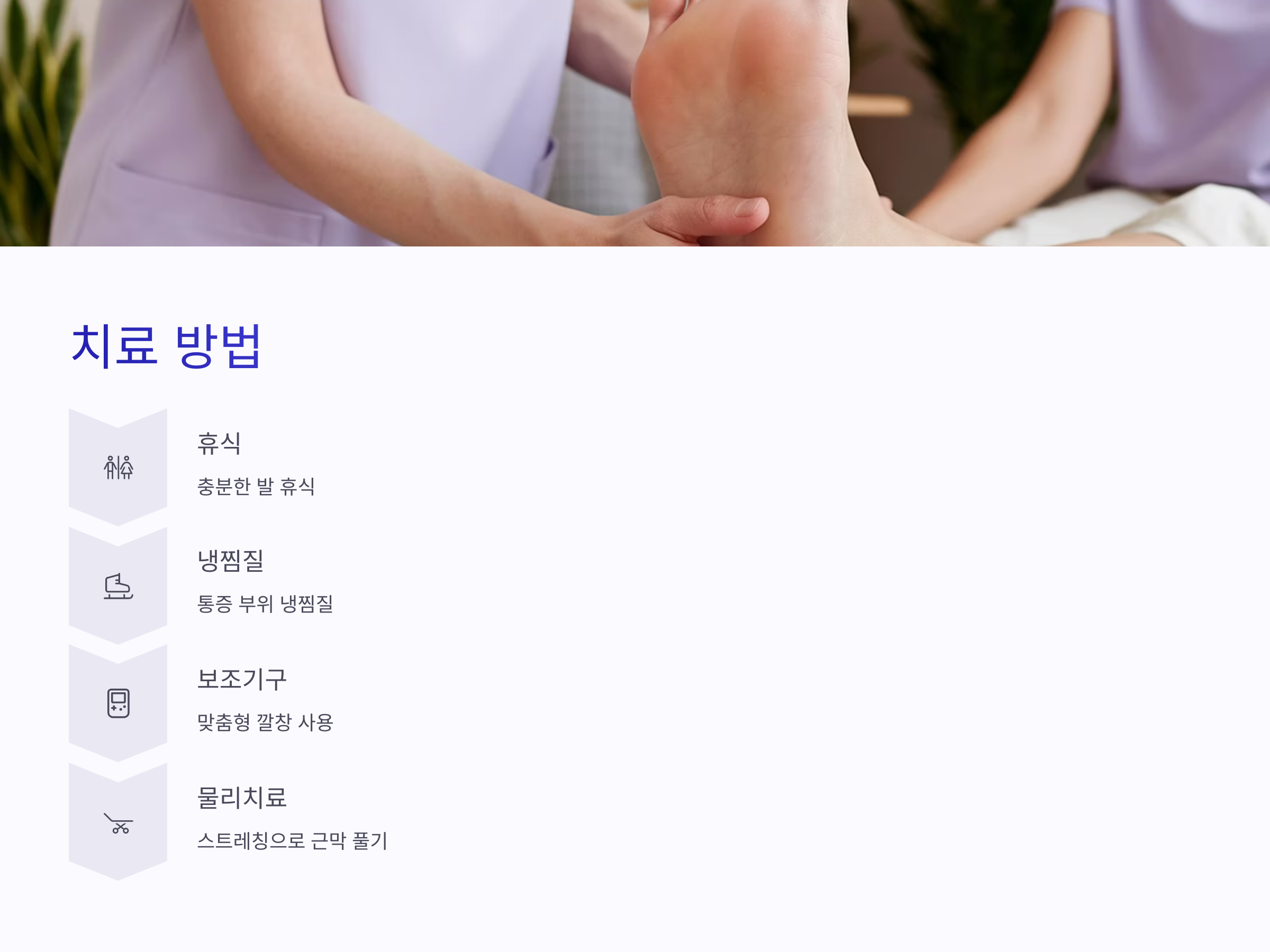 치료 방법은 대부분 보존적인 방법으로 시작됩니다. 초기에는 충분한 휴식과 발을 쉬게 해주는 것이 중요하며, 통증이 심할 경우 냉찜질이나 진통제를 사용할 수 있습니다. 또한, 발을 지지해주는 보조 기구나 맞춤형 깔창을 사용하는 것도 효과적입니다. 이 외에도 물리치료나 스트레칭을 통해 족저근막을 풀어주는 것도 치료에 도움이 됩니다.