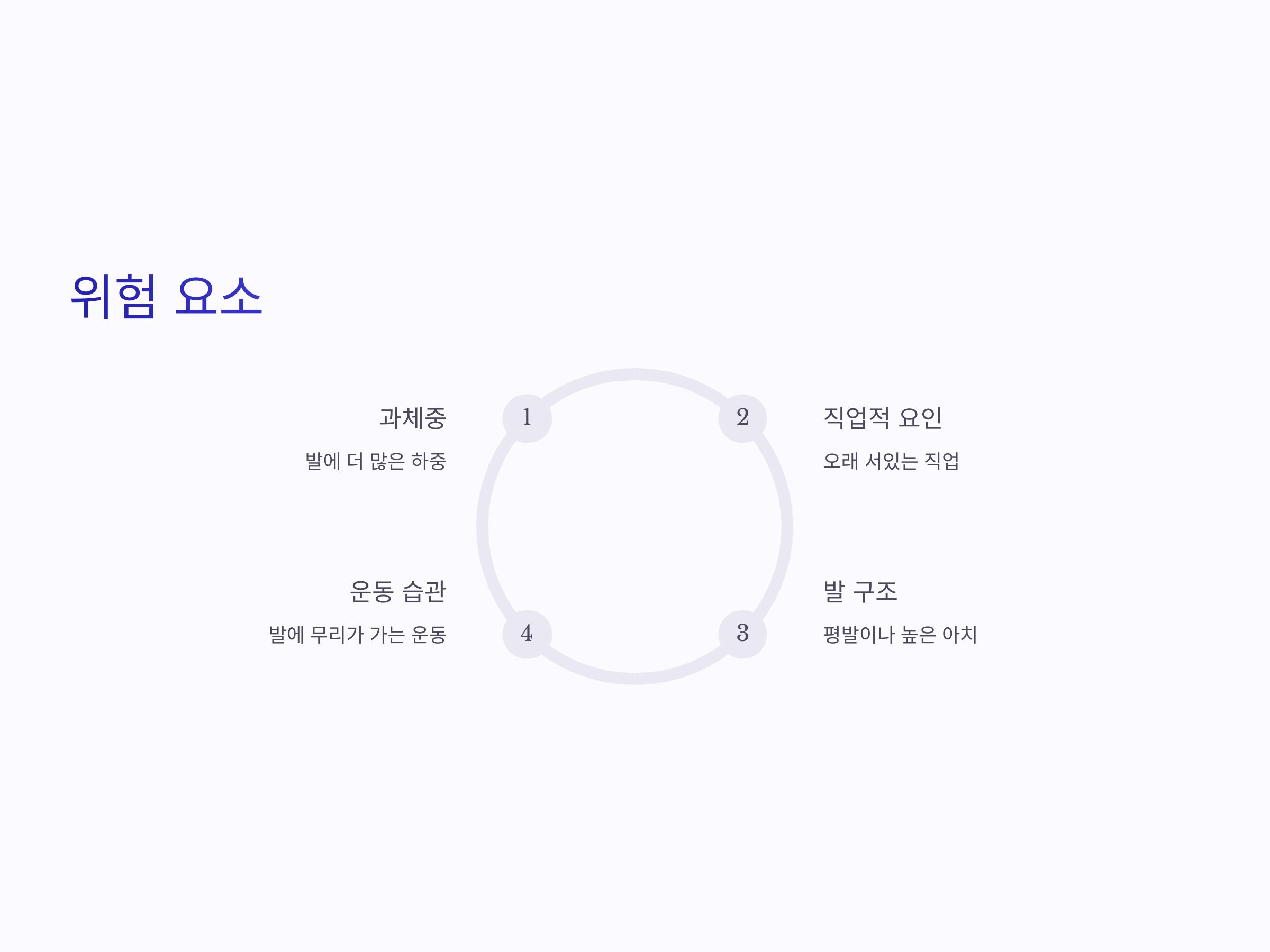 이 외에도 발이 평발이거나 아치가 높아 발의 균형이 맞지 않으면 족저근막염이 발생할 수 있습니다. 발목의 과도한 회전, 발에 무리가 가는 운동 등이 원인으로 작용할 수 있기 때문에, 발에 대한 신경 쓰는 것이 중요합니다.