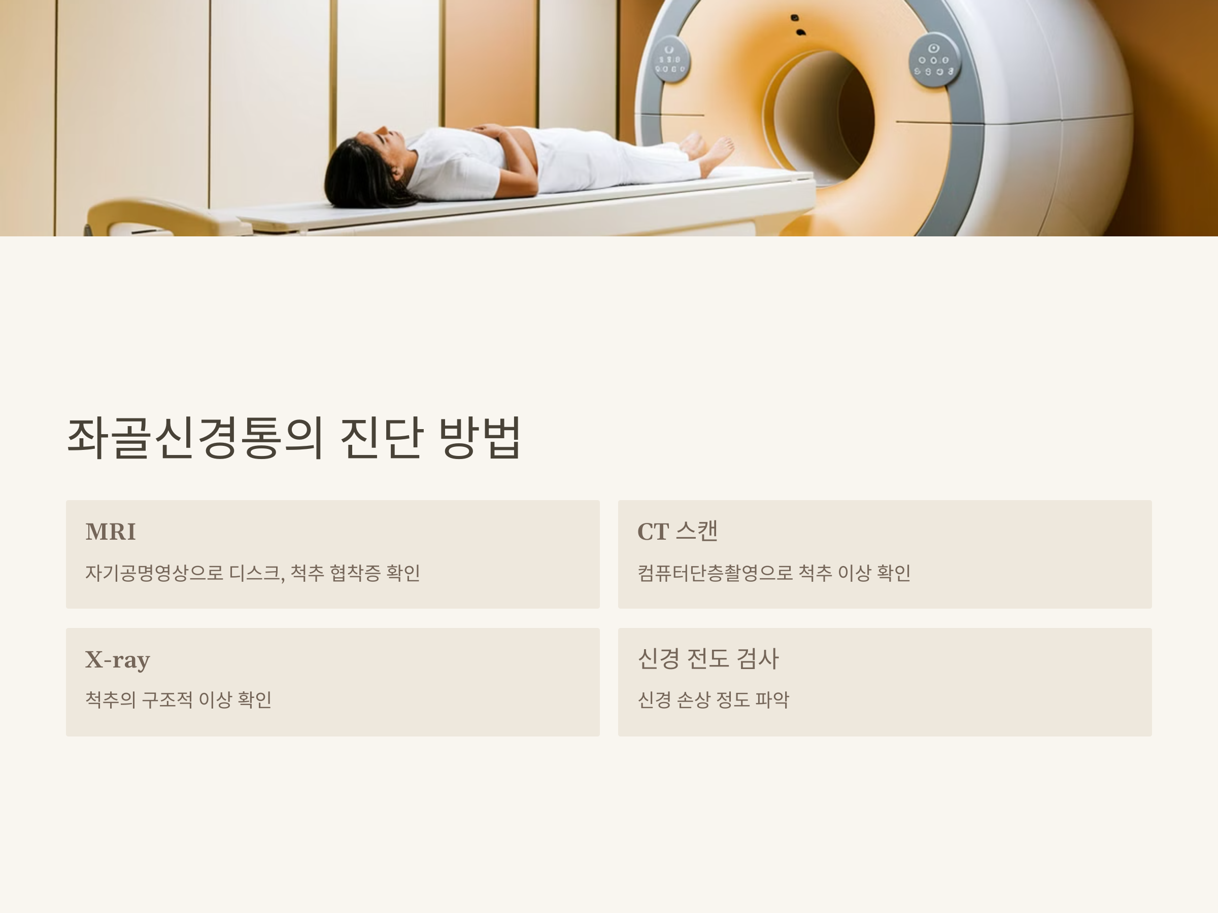 좌골신경통이 의심된다면, 정확한 진단을 위해 병원을 방문하는 것이 중요합니다. 진단을 위해 가장 많이 사용되는 방법은 MRI(자기공명영상)와 CT(컴퓨터단층촬영)입니다. 이 두 가지 검사 방법을 통해 디스크 탈출증이나 척추 협착증, 종양 등의 원인을 파악할 수 있습니다.