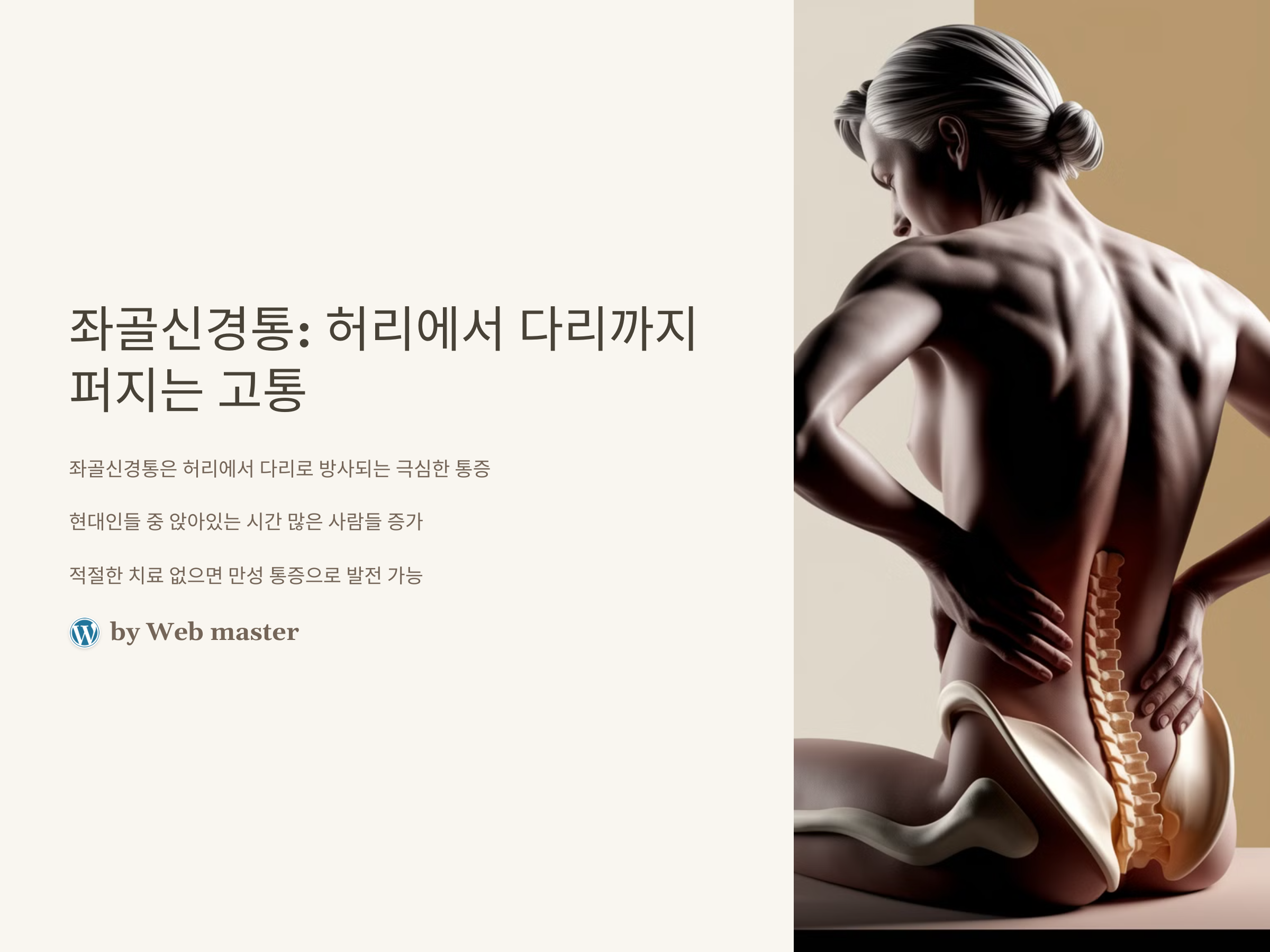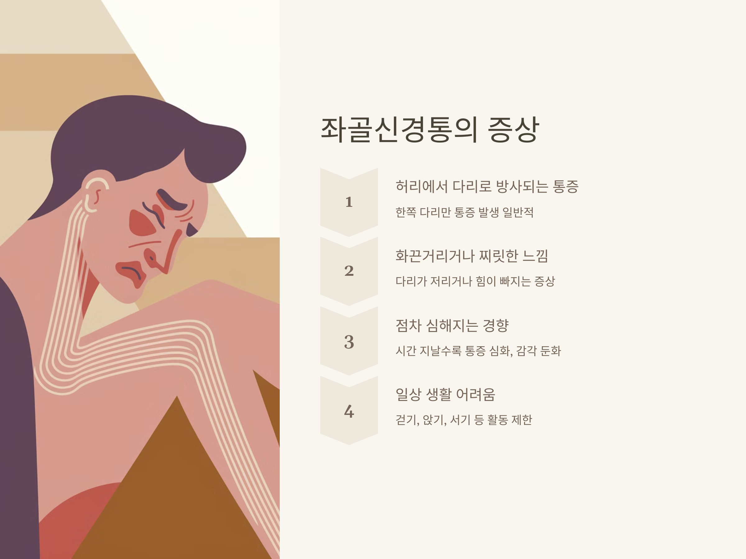 좌골신경통은 허리에서 다리로 방사되는 극심한 통증을 의미합니다. 허리 통증이 다리로 퍼져나가는 이 증상은 일상생활에 큰 지장을 줄 수 있으며, 좌골신경을 자극하거나 압박하는 여러 가지 원인에 의해 발생합니다. 이 통증은 일시적일 수도 있지만, 적절한 치료가 이루어지지 않으면 만성적인 문제로 발전할 수 있습니다. 좌골신경통의 원인, 증상, 치료법, 예방 방법까지 자세히 알아보겠습니다.