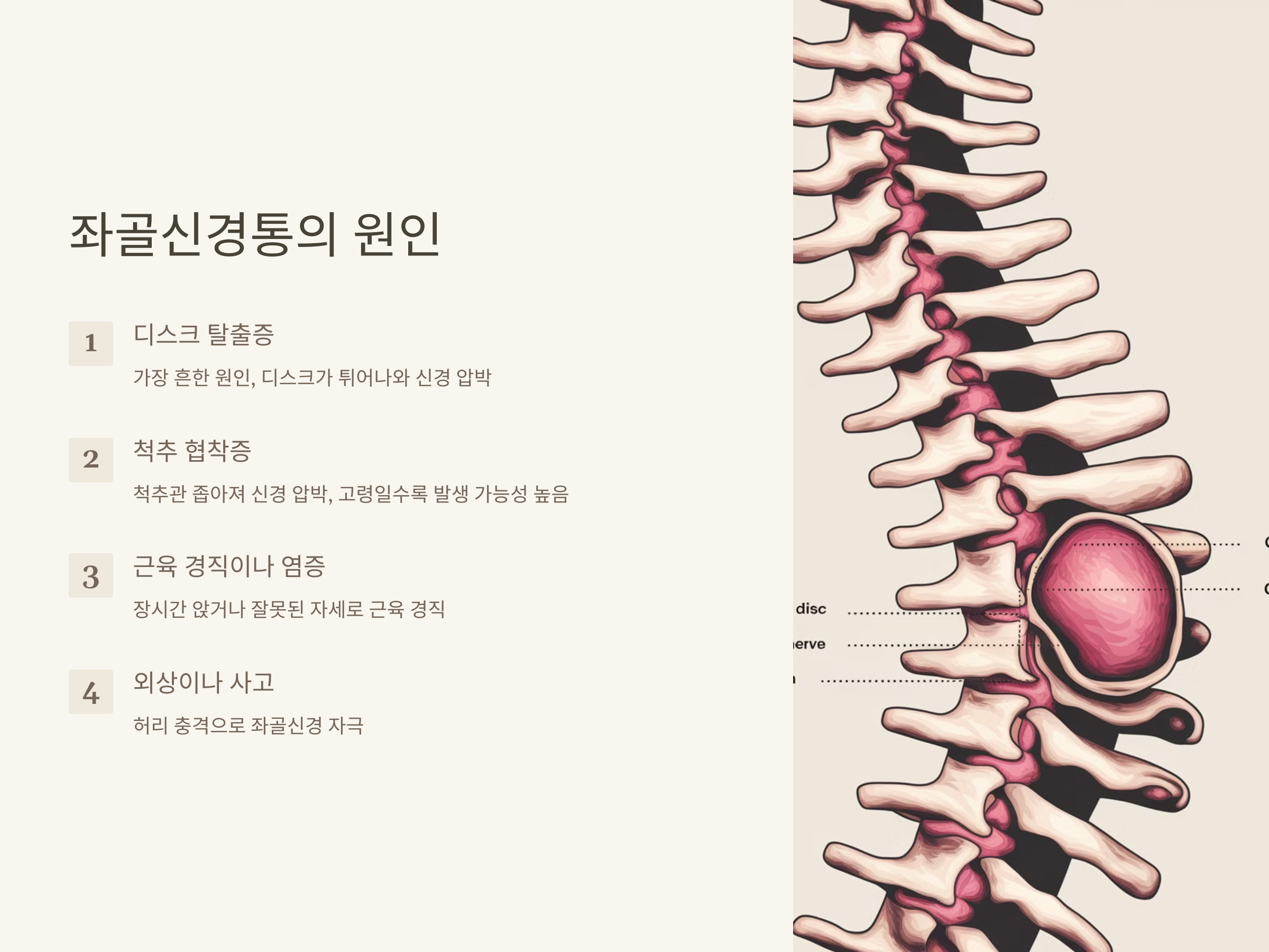 첫째, 디스크 탈출증이 가장 흔한 원인입니다. 척추 뼈 사이에 있는 디스크가 튀어나오거나 찢어져서 신경을 압박하게 되면 통증이 발생합니다. 특히 L4-L5, L5-S1 부위에서 많이 발생하며, 이 부분이 신경을 눌러 좌골신경통을 유발할 수 있습니다.