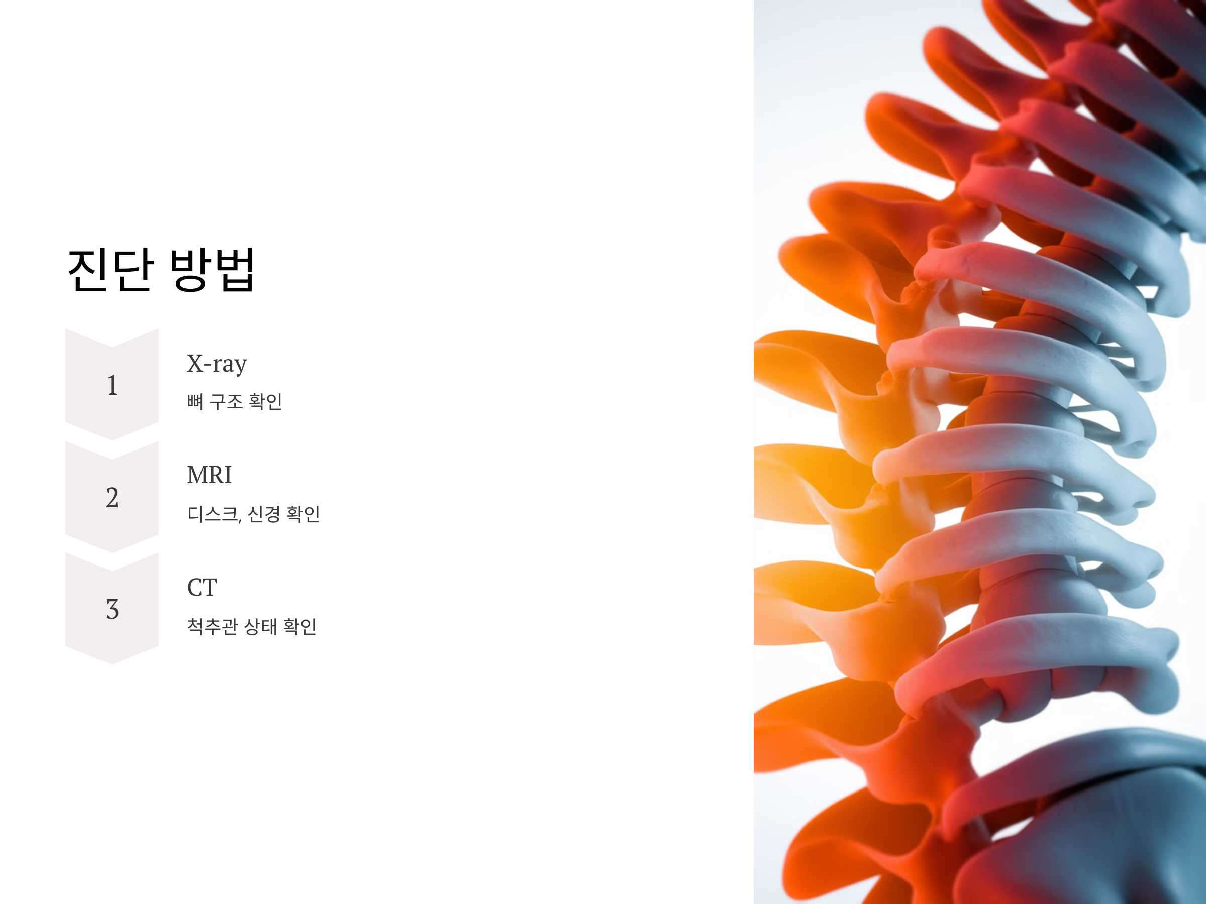 좌골 신경통을 진단하기 위해서는 여러 가지 검사와 평가가 필요합니다. 일반적으로 X-ray, MRI, CT 등의 영상 검사로 문제의 원인을 찾을 수 있습니다. 이를 통해 디스크 탈출이나 척추관 협착증 등과 같은 원인을 파악할 수 있으며, 필요한 경우 추가적인 신경학적 검사나 체중 부하 검사도 진행될 수 있습니다.