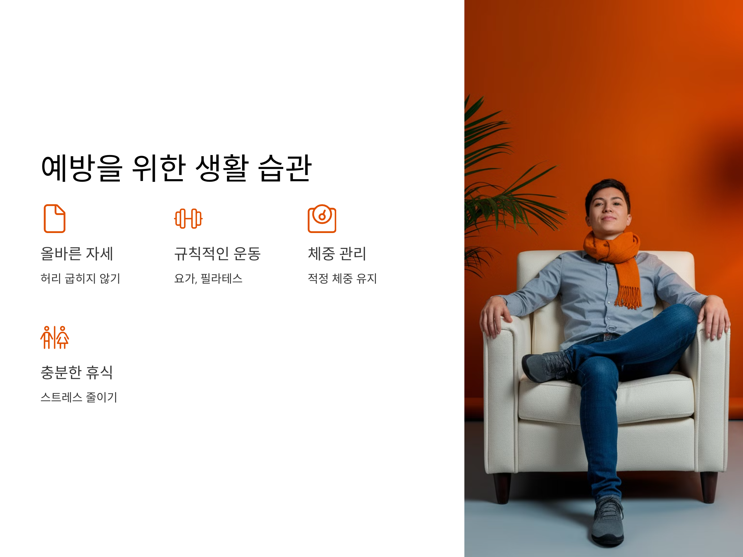 올바른 자세로 앉거나 서는 습관을 들여야 합니다. 허리를 굽히지 않도록 하고, 바른 자세를 유지하는 것이 중요합니다.