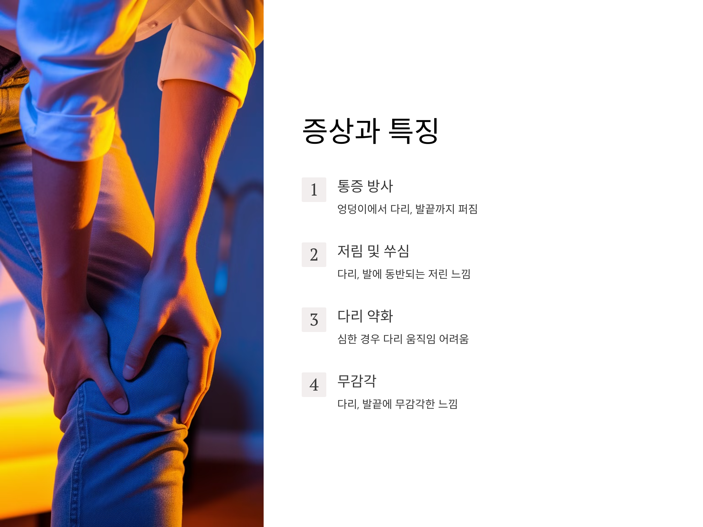 - 저린 느낌과 쑤시는 통증: 다리나 발에 저림이나 쑤시는 느낌이 동반될 수 있습니다.