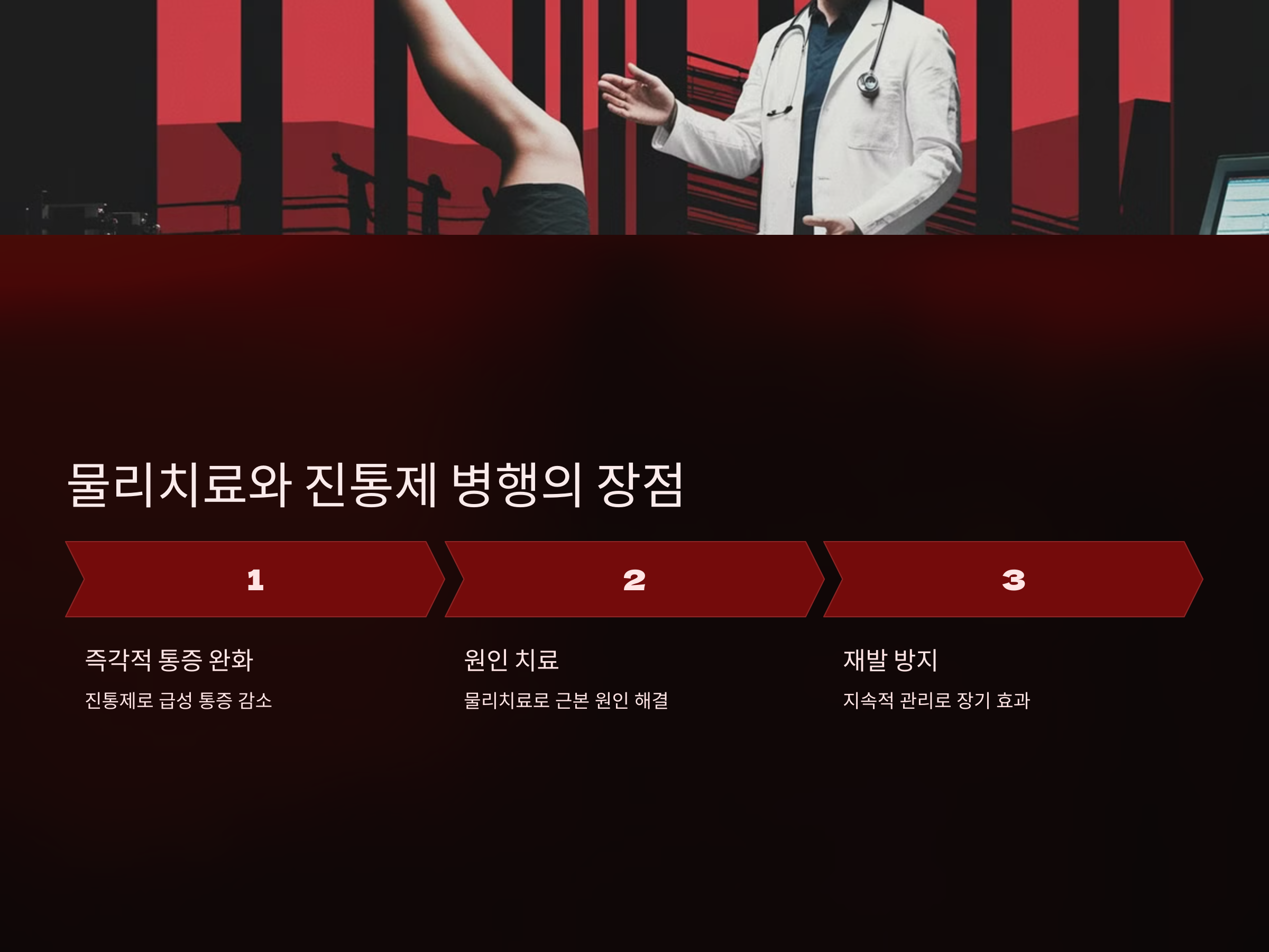 물리치료는 근본적인 원인인 신경 압박이나 근육 경직을 완화하는 데 초점을 맞추고, 진통제는 즉각적인 통증을 완화하는 데 도움이 됩니다. 이를 병행하면 통증이 심한 상태에서도 보다 빠르게 회복할 수 있으며, 치료의 효과를 극대화할 수 있습니다.