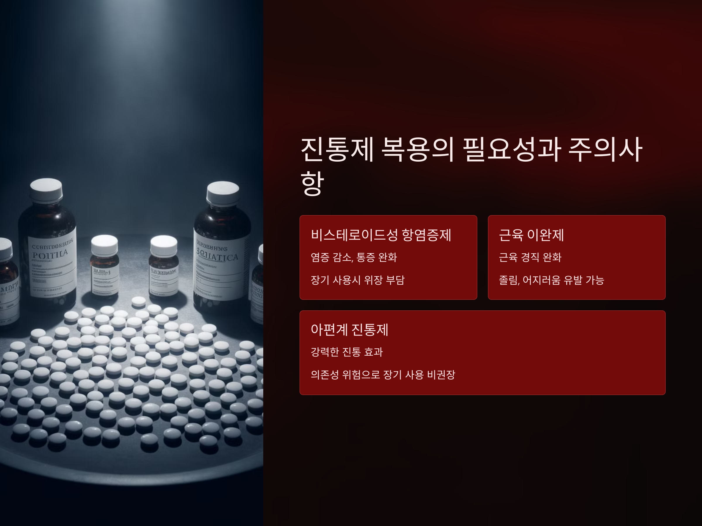 진통제는 통증을 완화하지만, 과용하면 부작용이 발생할 수 있습니다. 특히 NSAIDs는 장기 사용 시 위장에 부담을 줄 수 있기 때문에, 사용 기간을 적절히 조절해야 합니다.