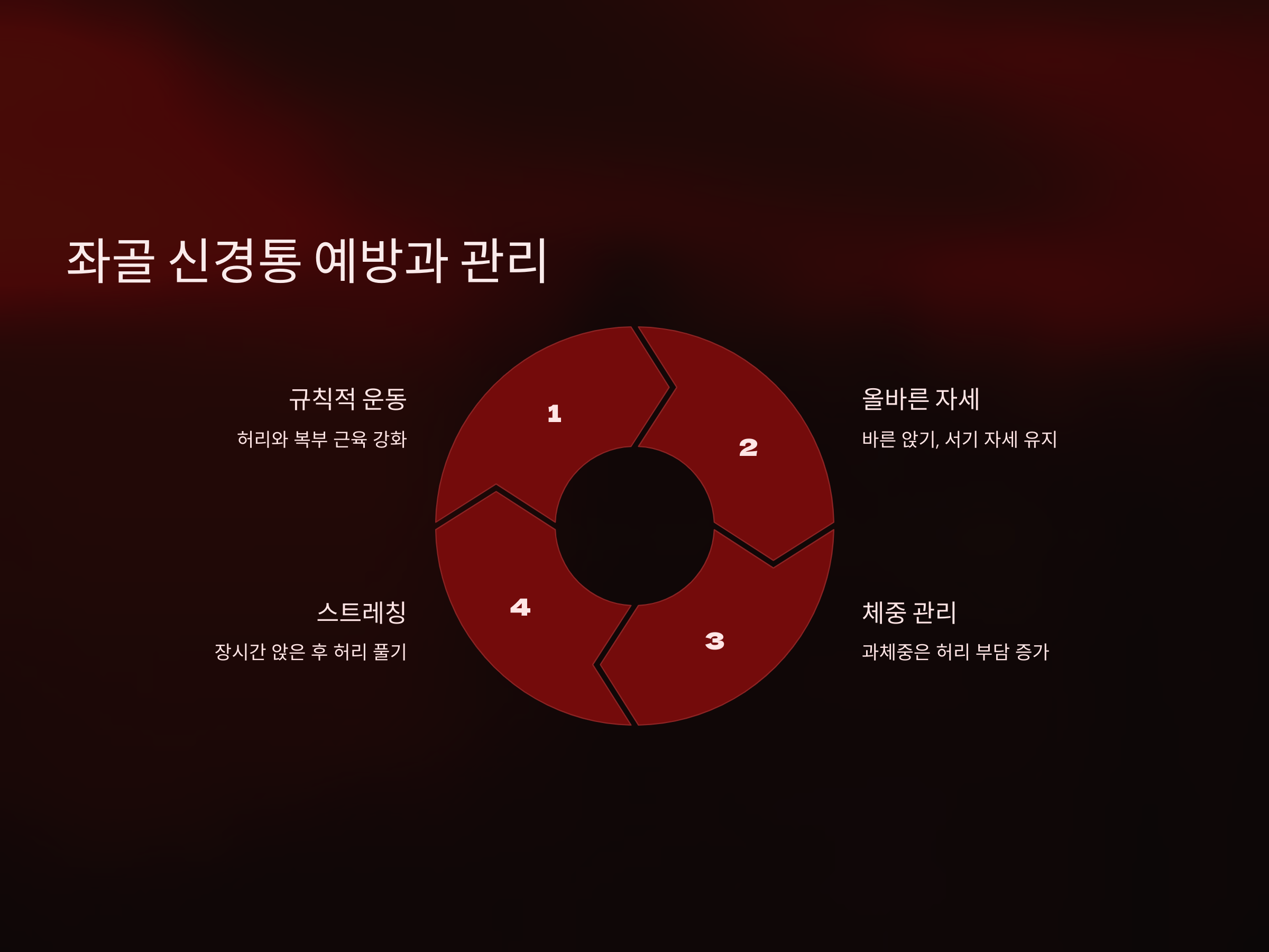물리치료와 진통제 복용 외에도, 좌골 신경통의 예방과 관리를 위한 방법들이 있습니다.