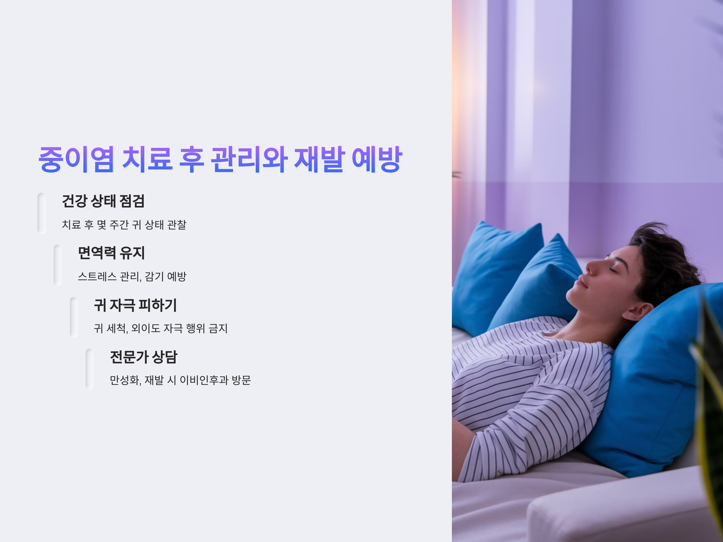 중이염이 치료된 후에는 재발을 방지하기 위한 관리가 필요합니다. 치료 후 몇 주 동안은 귀의 건강 상태를 점검하고, 과도한 스트레스나 감기에 걸리지 않도록 면역력을 유지하는 것이 중요합니다. 또한, 귀를 세척하거나 외이도를 자극하는 행위는 피해야 합니다.