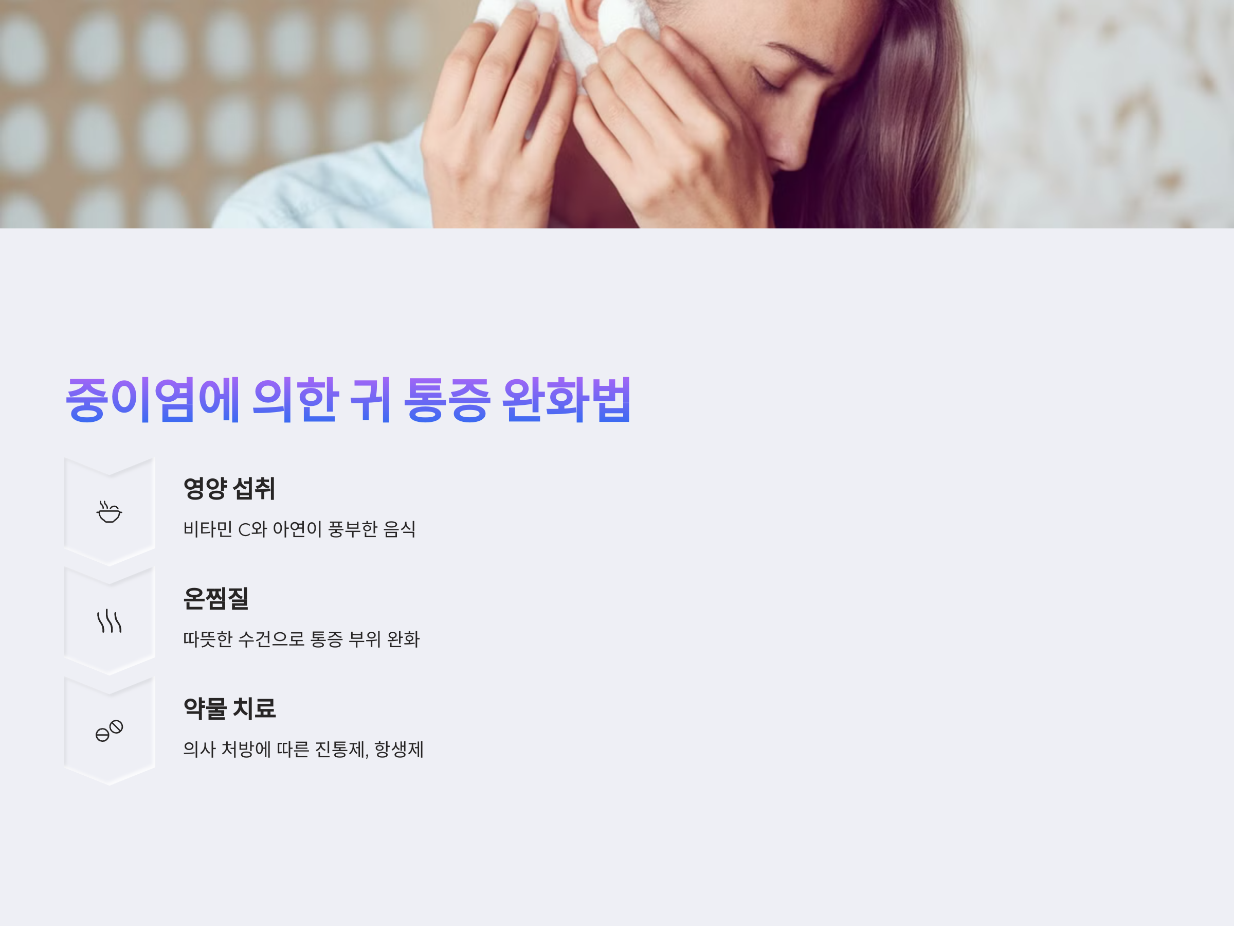 중이염으로 인한 귀 통증은 매우 고통스러울 수 있습니다. 하지만 몇 가지 방법으로 통증을 완화할 수 있습니다. 첫째, 통증이 심할 경우, 비타민 C와 아연이 풍부한 음식을 섭취하는 것이 도움이 될 수 있습니다. 이러한 영양소는 면역력을 증진시켜 중이염의 치료에 도움을 줄 수 있습니다.