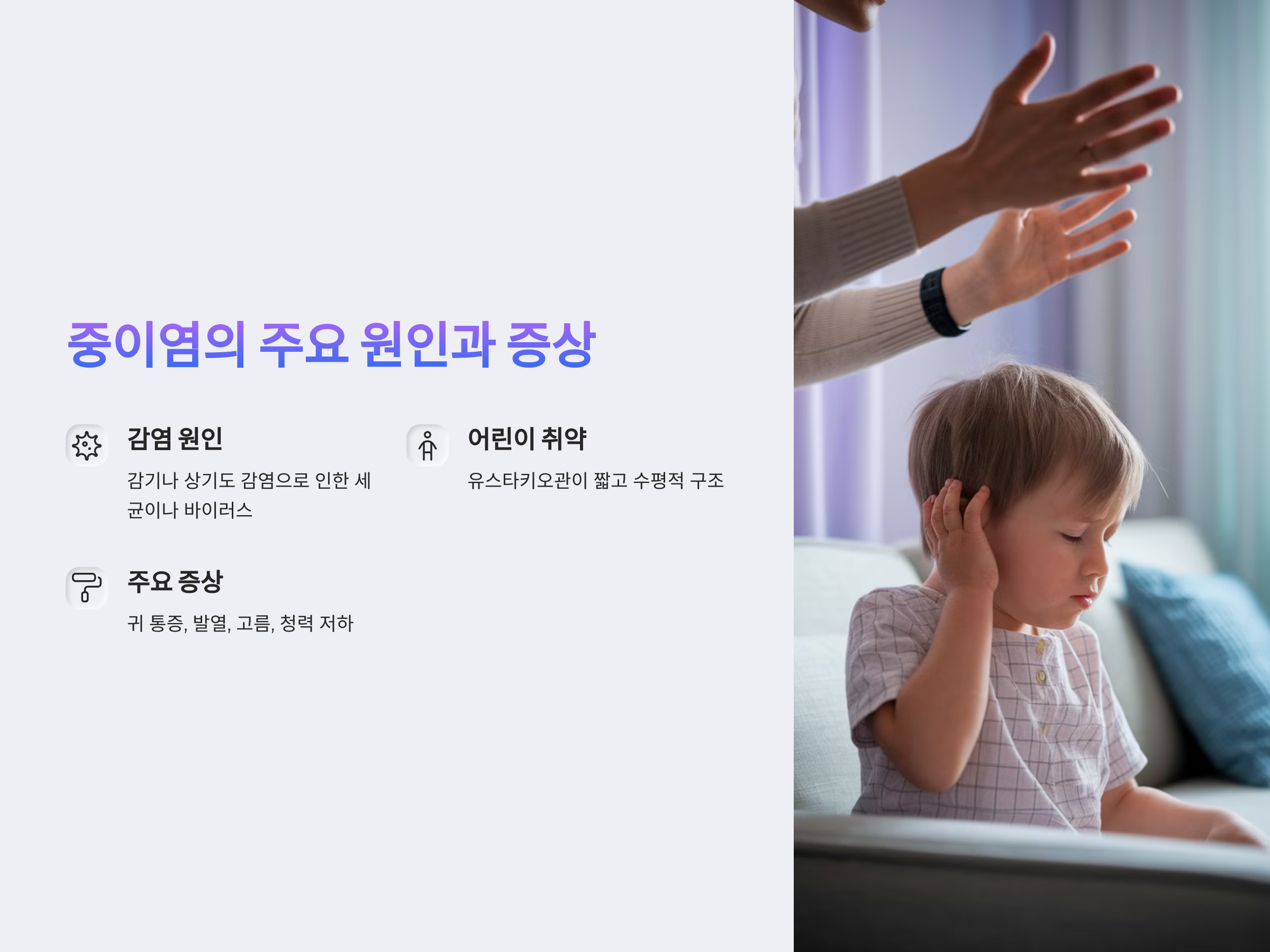 중이염은 주로 감염으로 인해 발생하는데, 감기나 상기도 감염으로 인한 세균이나 바이러스가 귀 안으로 침투하면서 염증을 일으킵니다. 이러한 감염은 특히 어린이들에게 더 자주 발생하는데, 그 이유는 어린이들의 유스타키오관이 성인보다 짧고 수평으로 되어 있어 세균이 쉽게 귀 안으로 유입되기 때문입니다.