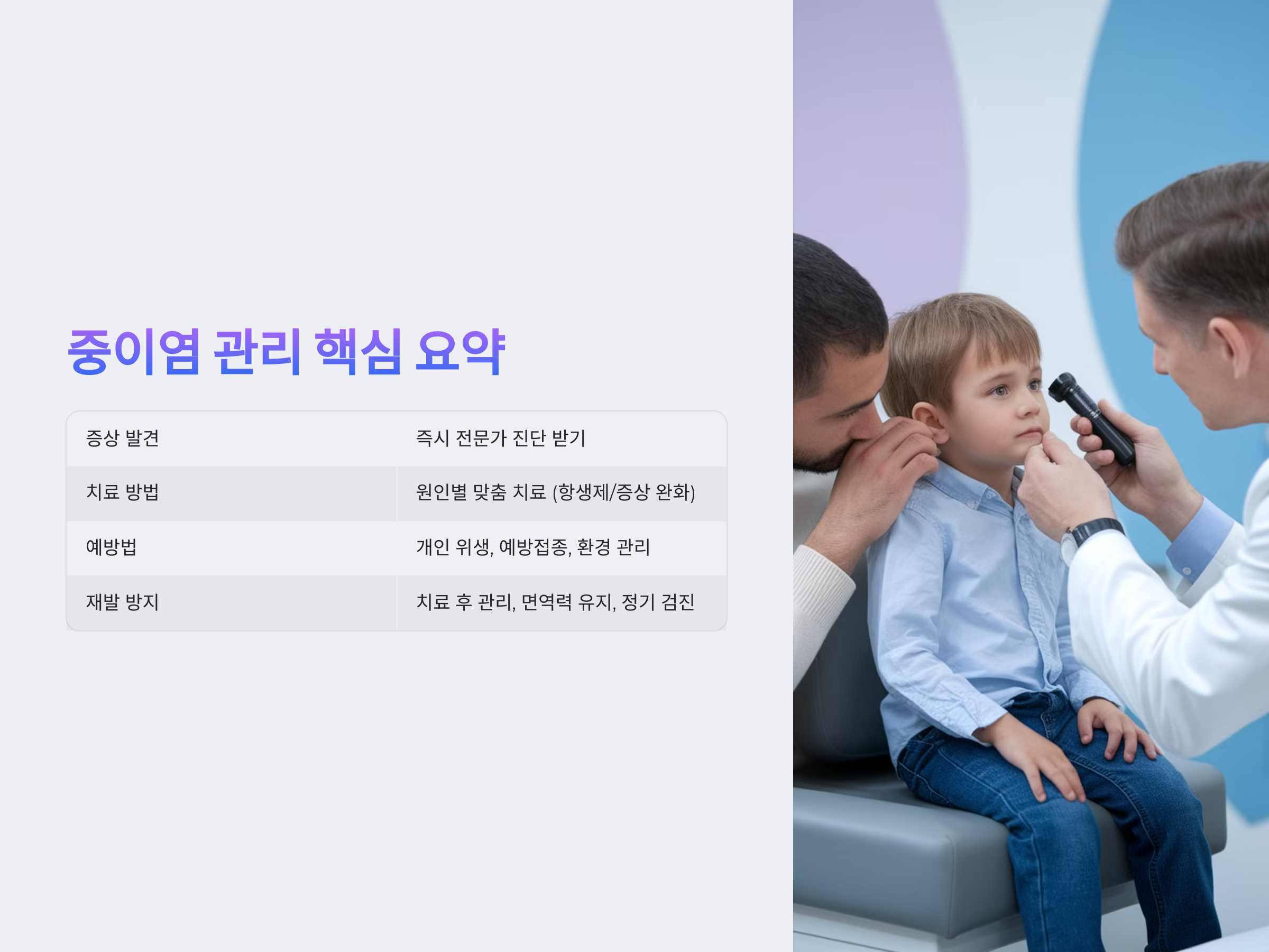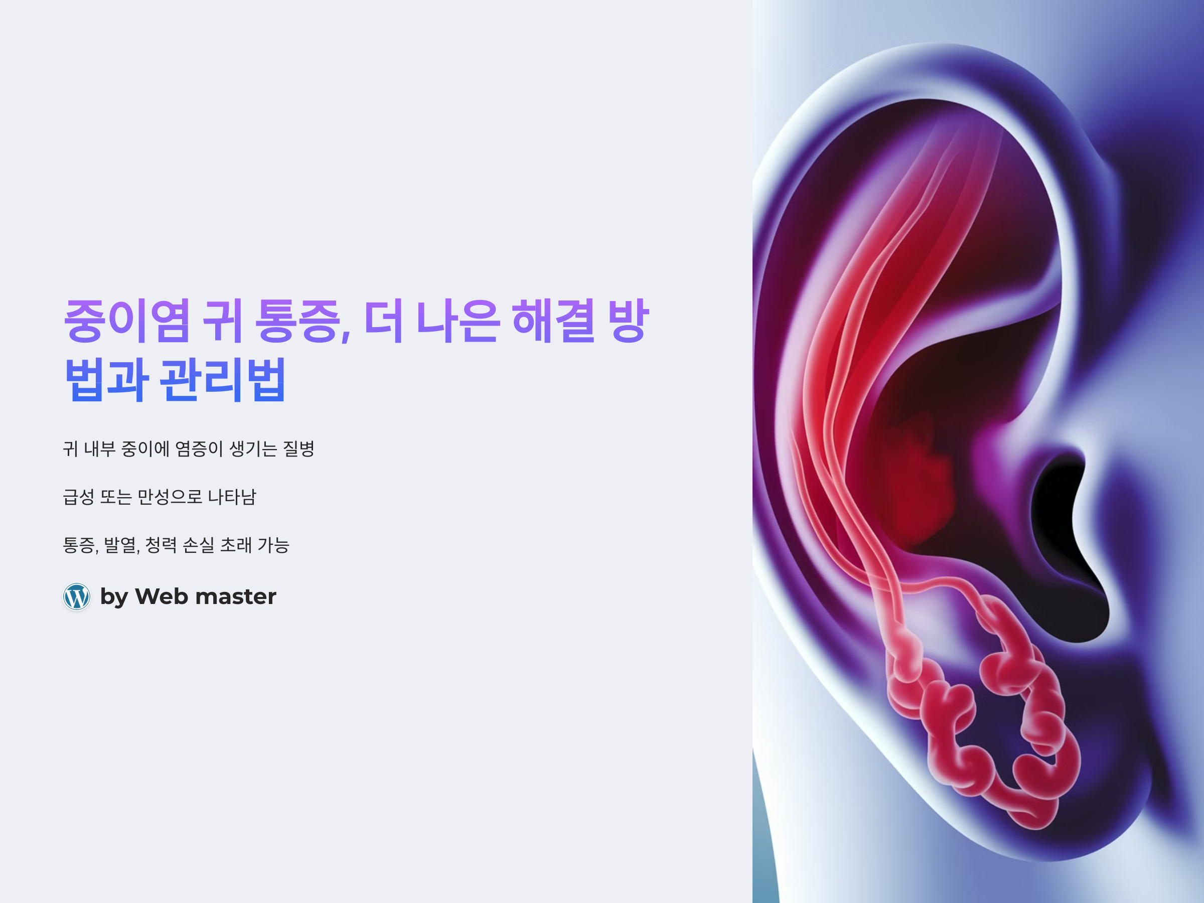 중이염은 귀 통증을 유발하는 일반적인 질병이지만, 적절한 치료와 예방을 통해 이를 관리할 수 있습니다. 귀 통증이 발생했을 때는 반드시 전문가의 진단을 받고, 치료 방법을 신속하게 진행하는 것이 중요합니다. 예방을 위한 생활 습관 개선과 함께, 중이염의 원인에 대한 이해를 바탕으로 적극적인 관리가 필요합니다.