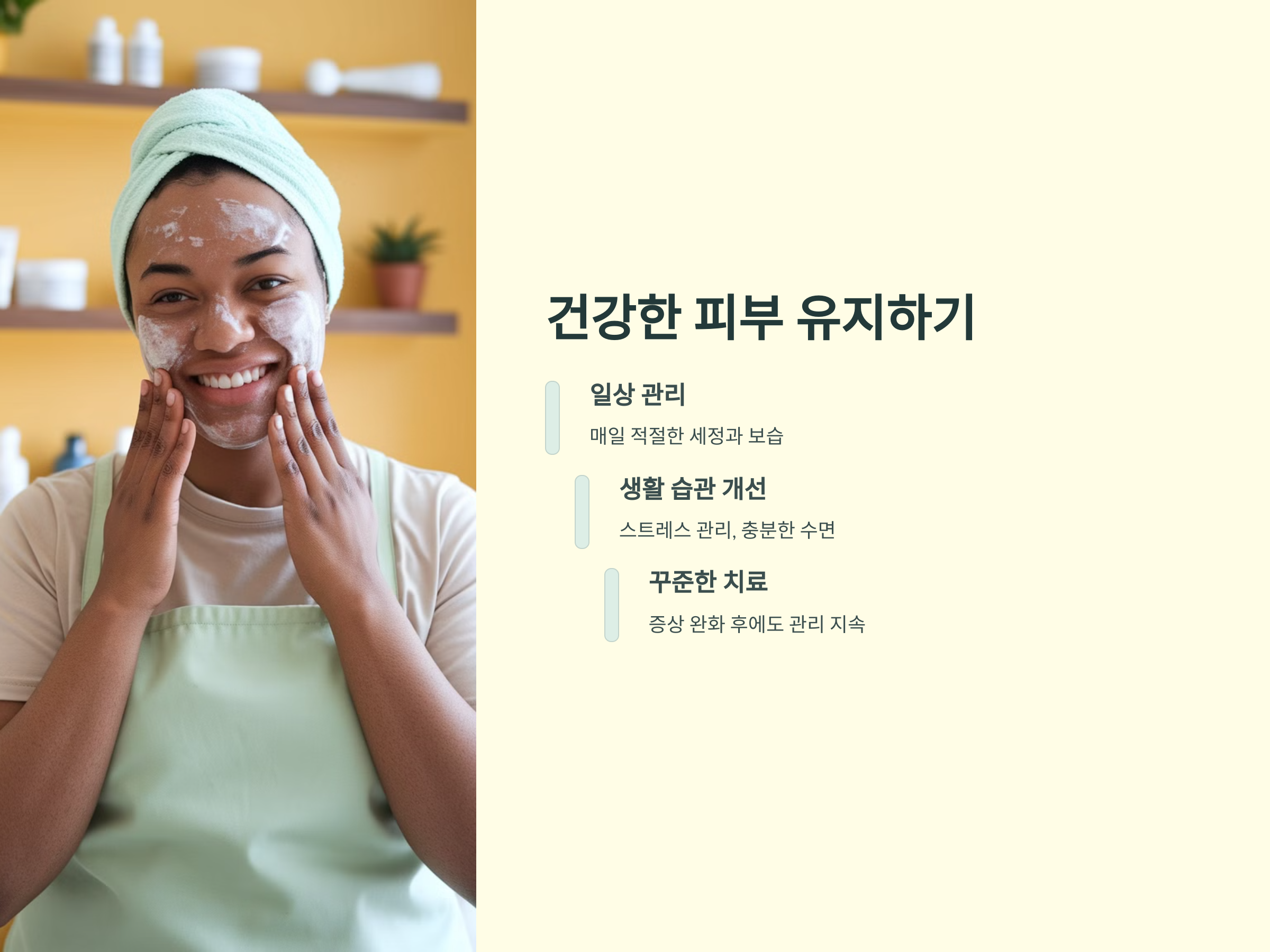 피부가 건조해지지 않도록 보습제를 꾸준히 사용하세요. 특히 세안 후나 샤워 후에 보습제를 바르는 것이 중요합니다.
