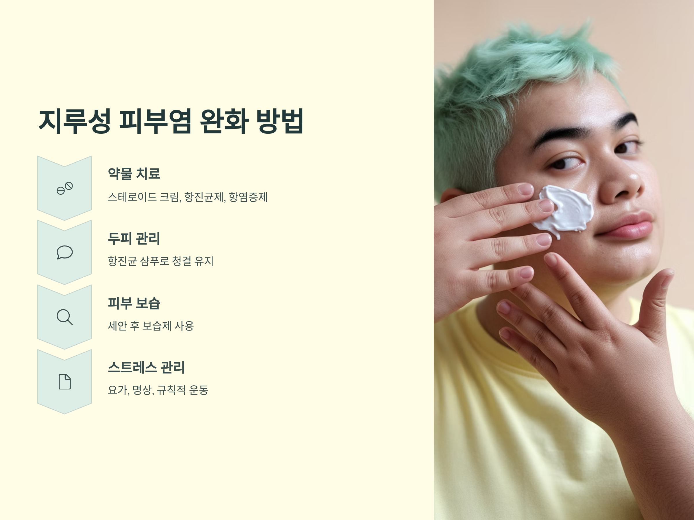 지루성 피부염은 완치가 어려운 질환이지만, 적절한 관리와 치료로 증상을 완화할 수 있습니다. 다음은 지루성 피부염을 완화하는 데 도움이 되는 방법들입니다.