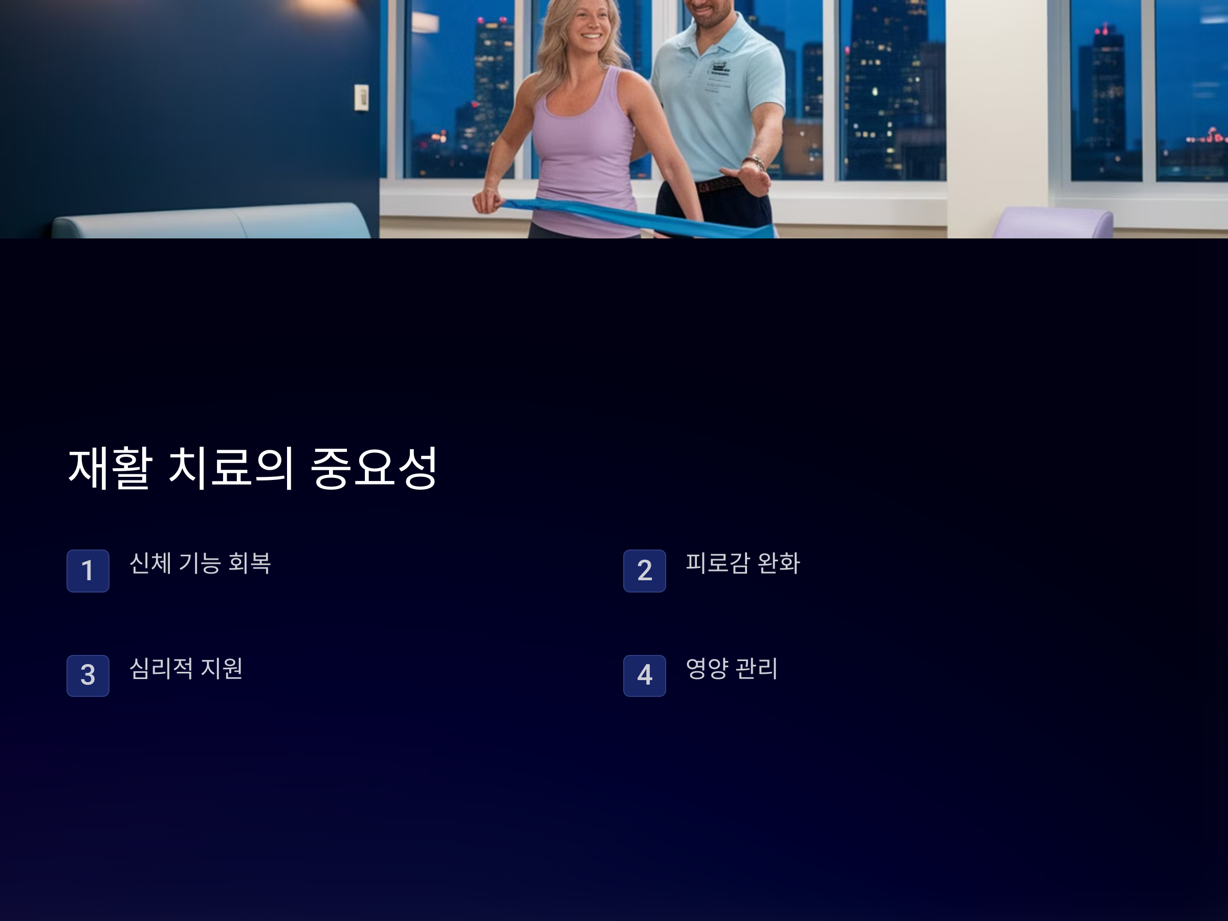 - 심리적 지원: 정신적인 안정과 스트레스 관리를 통해 회복을 돕습니다.