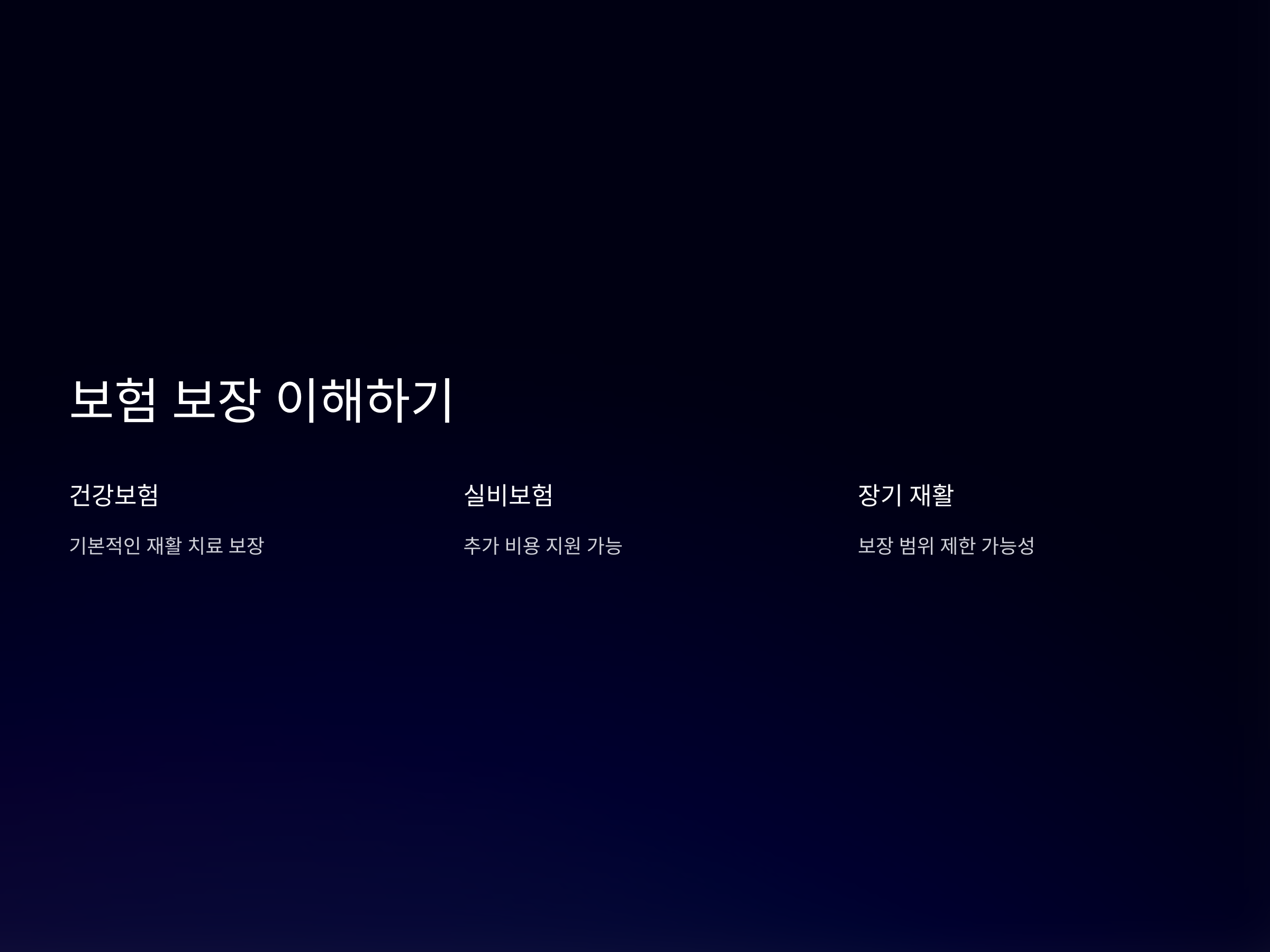 - 보험사에 상담 요청: 재활 치료와 관련된 보장 범위를 명확히 파악하고, 실비보험 등을 활용할 수 있는지 여부를 확인하세요.