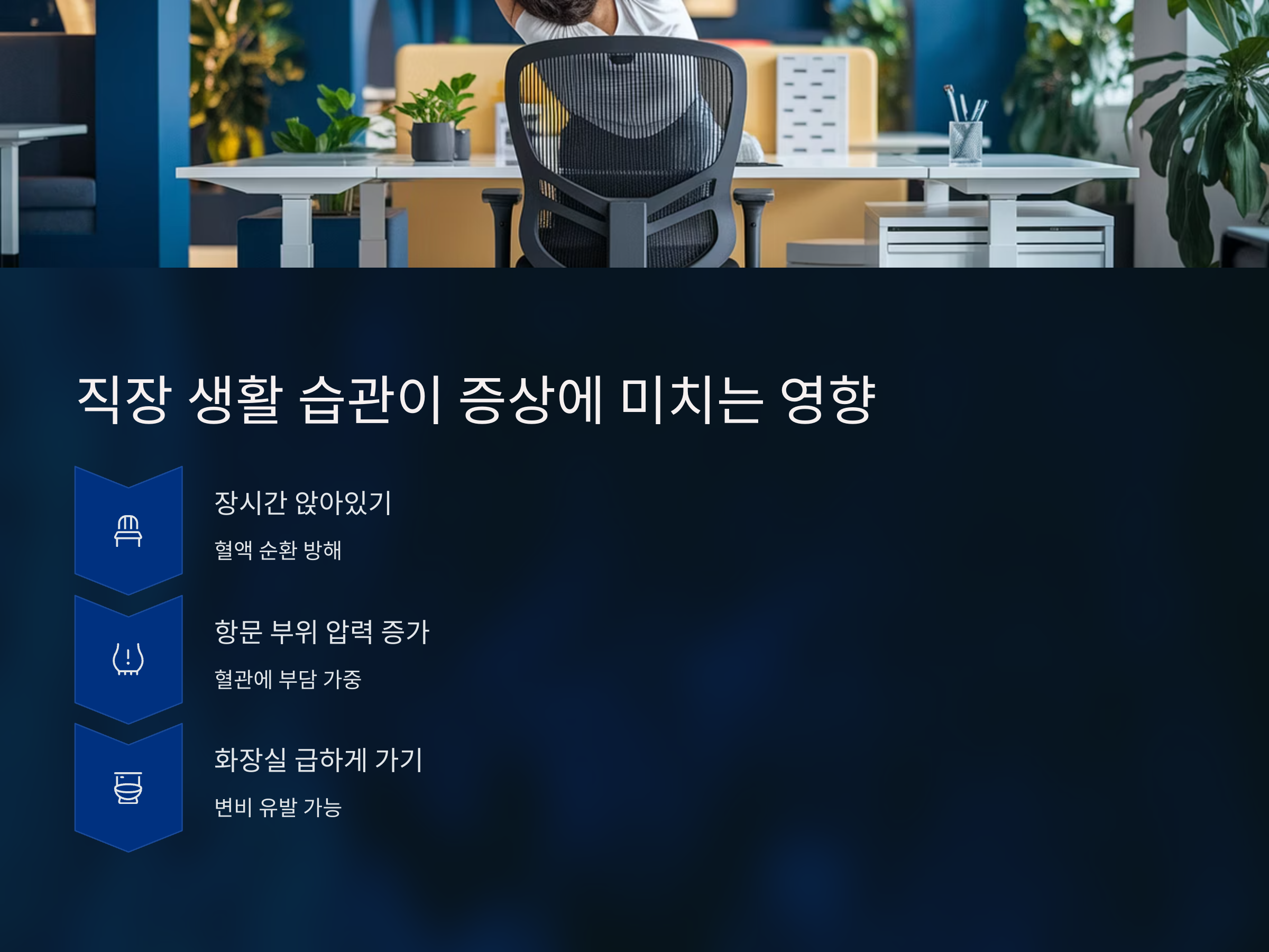 장시간 앉아 있는 직장 환경은 항문 주위의 혈액 순환에 악영향을 미칩니다. 앉아 있는 시간이 길어질수록 압력이 증가하여 항문 주위의 혈관에 부담을 주게 되며, 그 결과 치질과 같은 질환이 악화될 수 있습니다. 또한, 업무 중에는 급하게 화장실을 가는 경우가 많고, 이로 인해 변을 참거나 변비가 발생하기도 합니다. 변비는 항문에 과도한 압력을 가하게 되어 염증과 출혈을 유발할 수 있습니다.