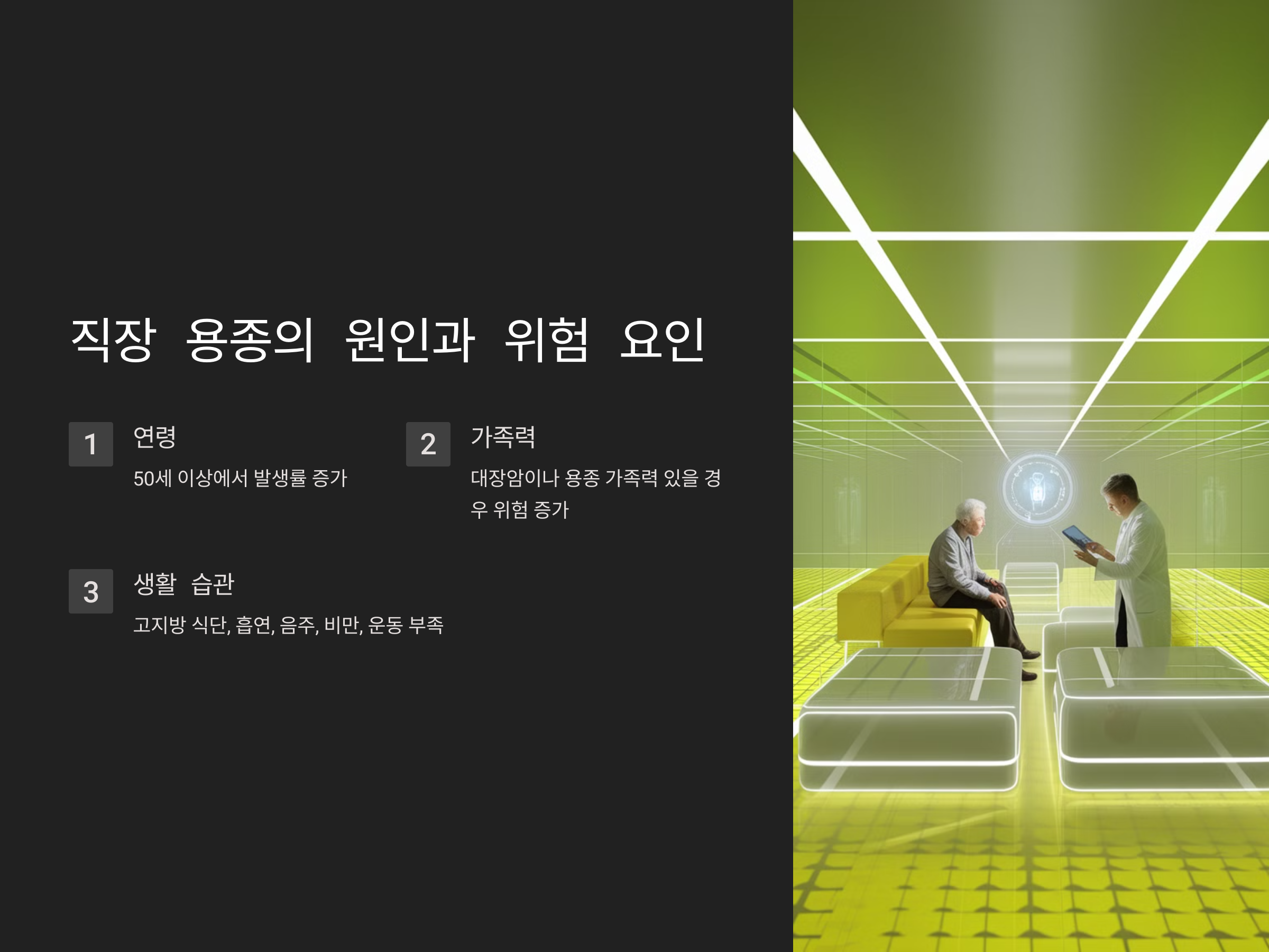 - 비만과 운동 부족: 신체 활동이 부족하고 비만인 경우, 용종 발생 위험이 높아집니다.