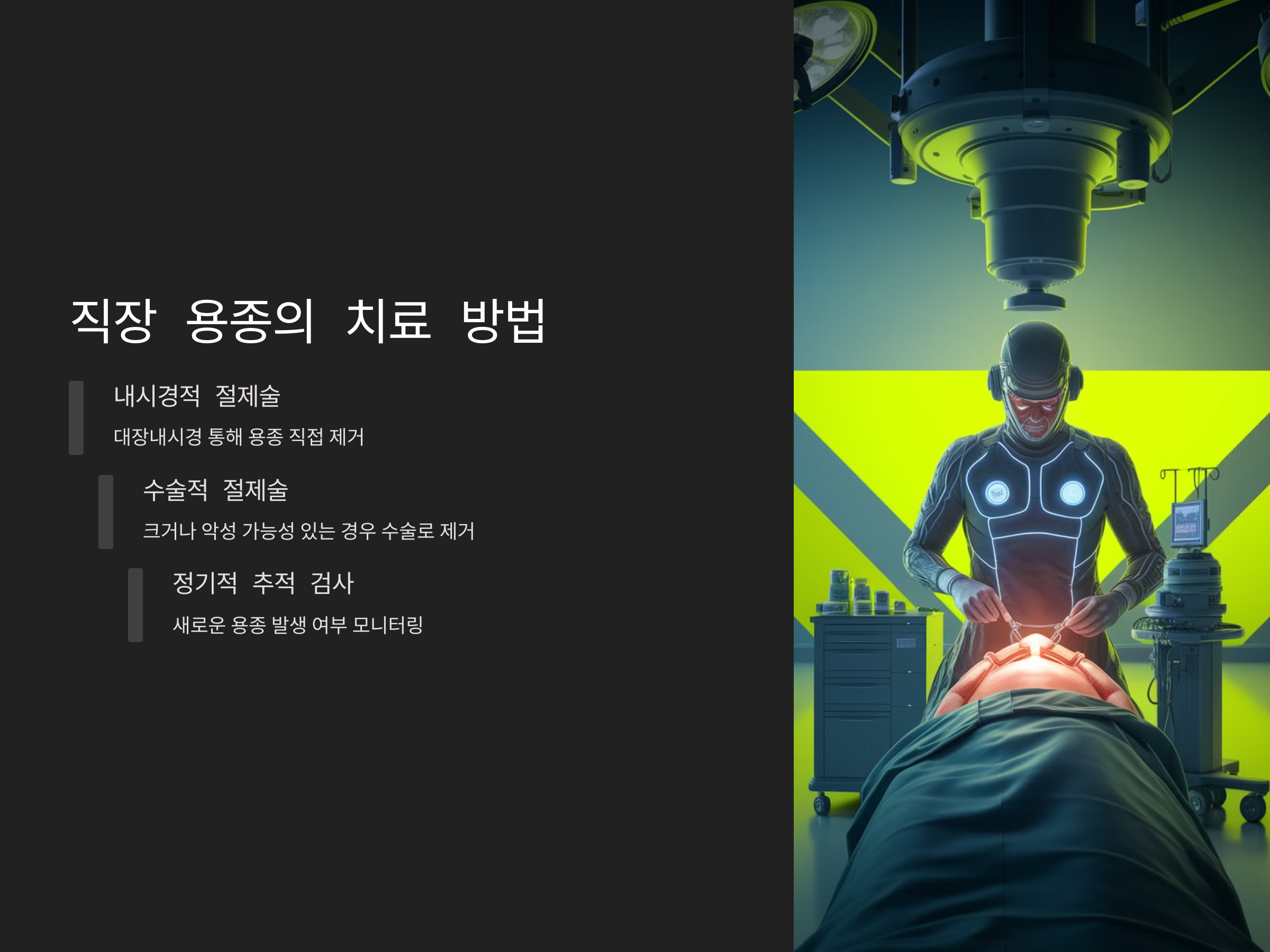- 수술적 절제술: 용종이 크거나 악성의 가능성이 있는 경우, 수술을 통해 제거합니다.