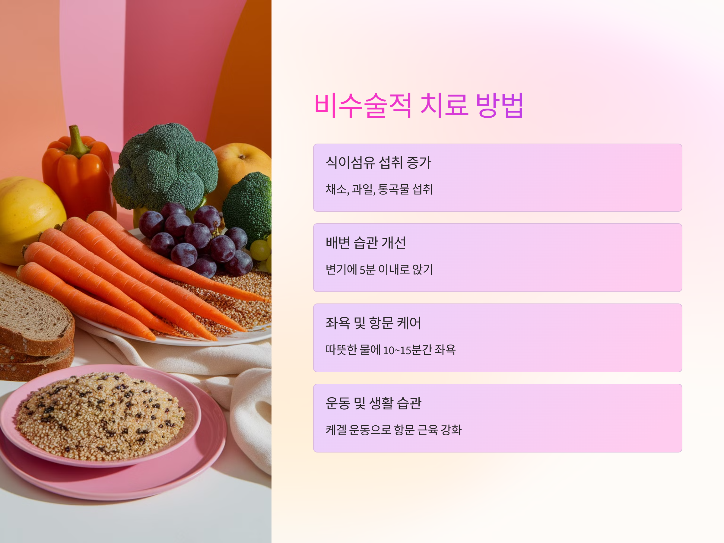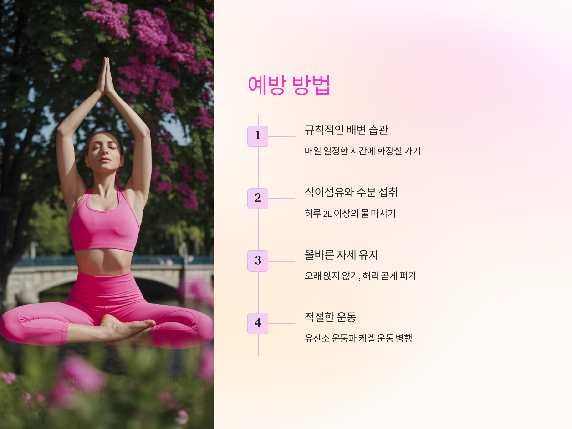 - 규칙적인 배변 습관 유지: 매일 일정한 시간에 화장실 가기