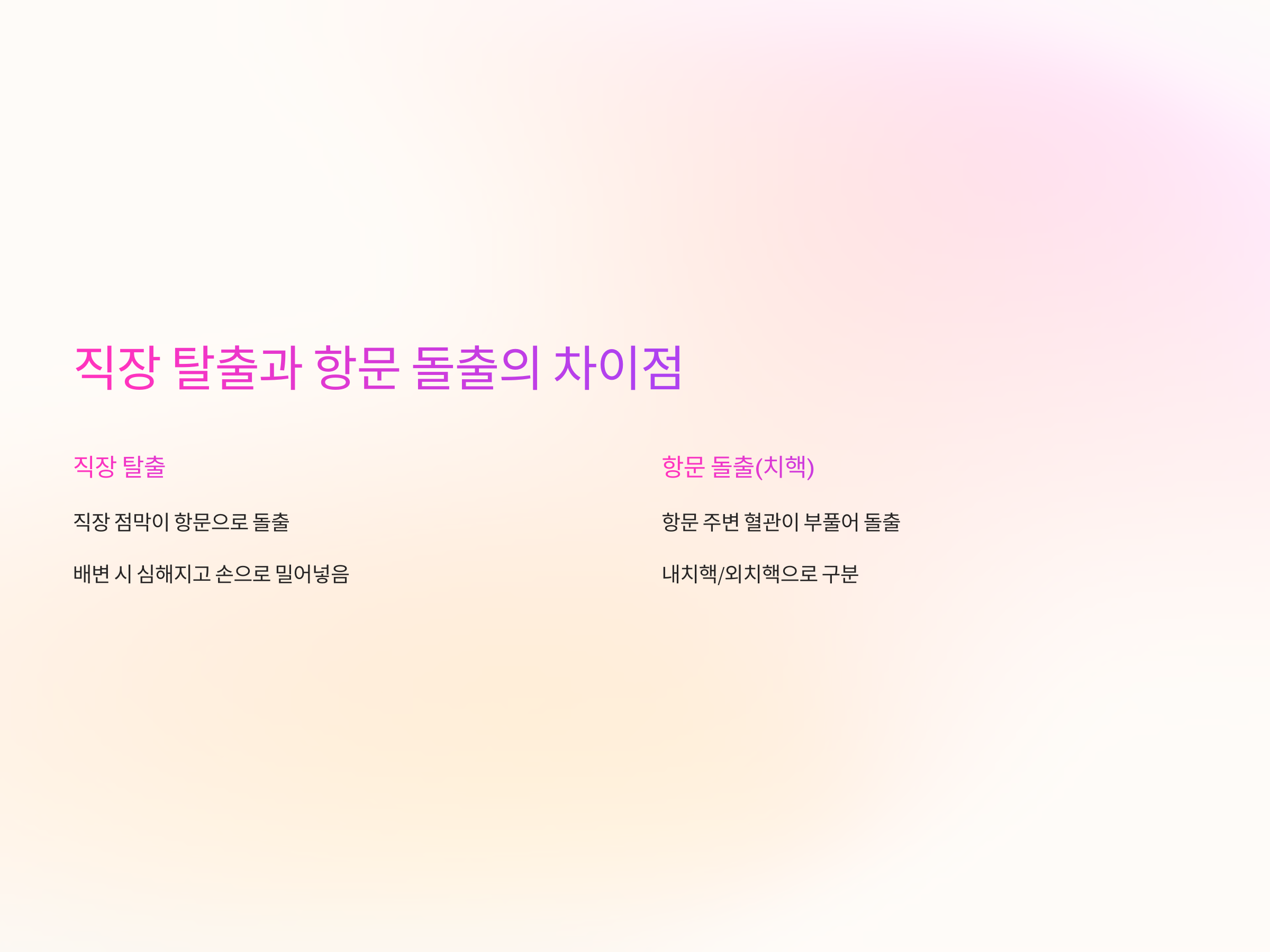 - "항문 돌출은 모두 치질이다?" → 직장 탈출과 치핵은 다름
