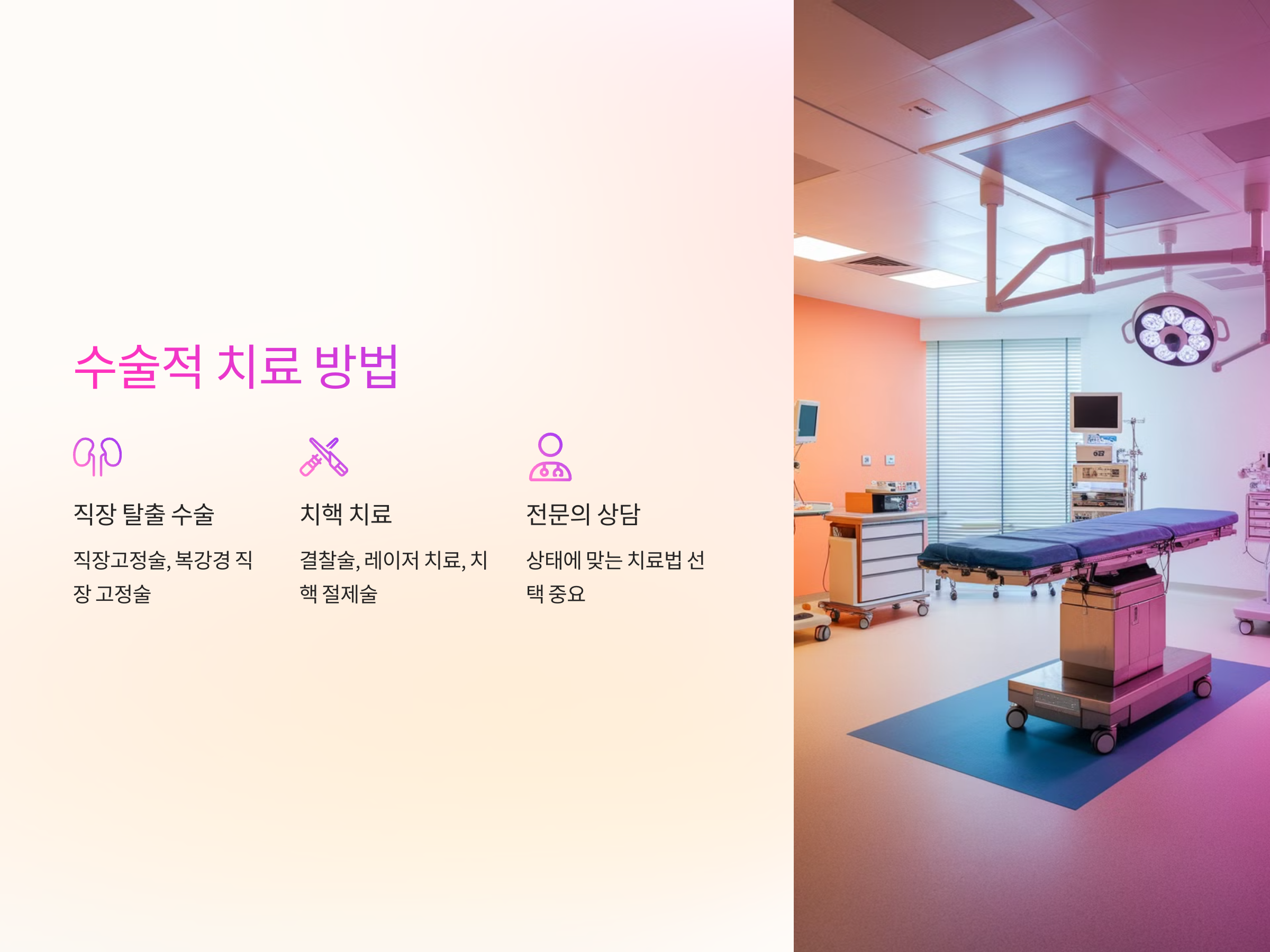 - 항문 돌출(치핵): 결찰술, 레이저 치료, 치핵 절제술 등 적용