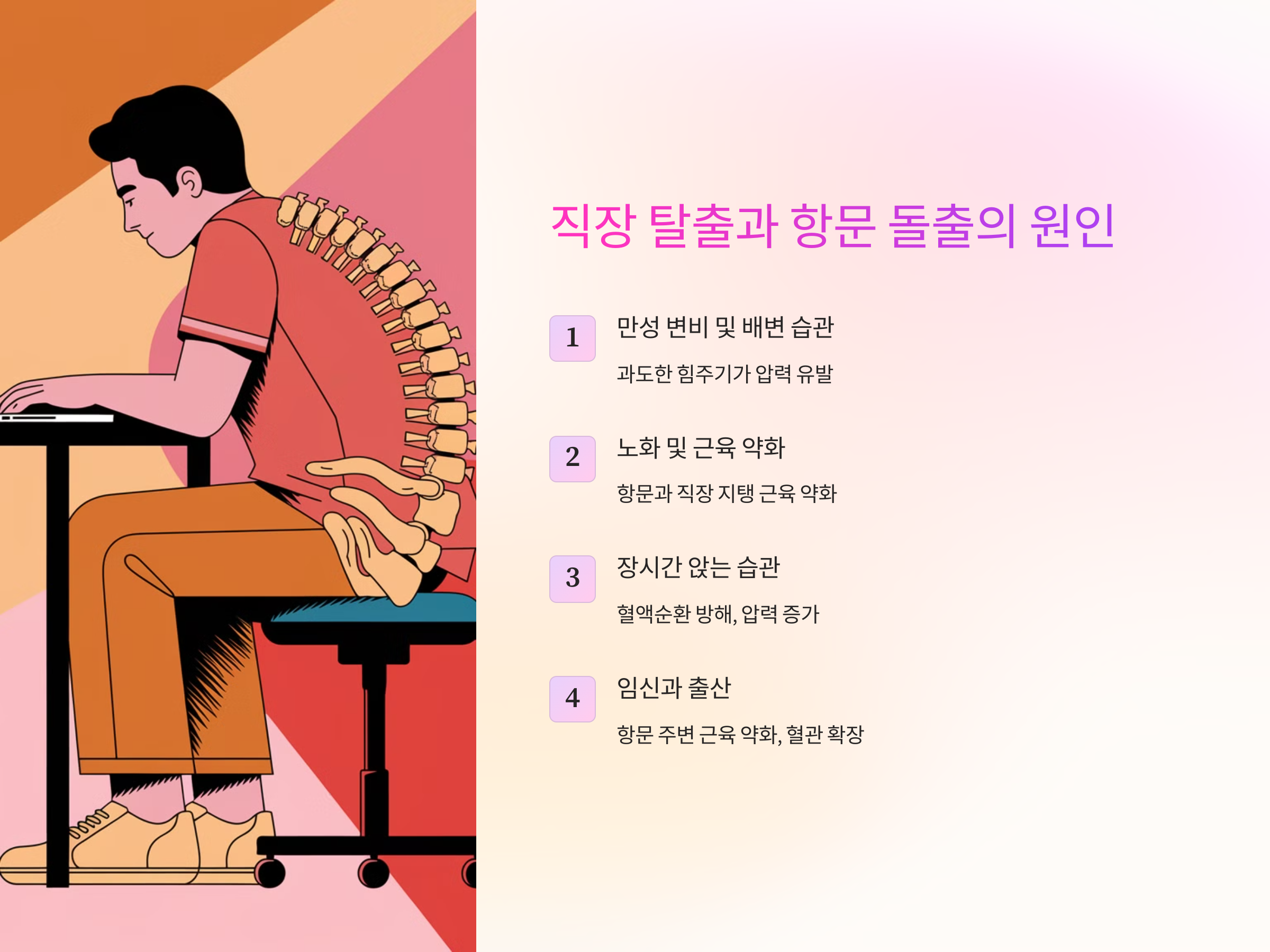 직장 탈출(직장 탈출증)과 항문 돌출(치핵)은 많은 사람들이 겪는 항문 질환 중 하나지만, 이를 방치하면 심각한 합병증을 초래할 수 있습니다. 특히 장시간 앉아 있는 직장인이나 변비를 자주 겪는 사람들에게 흔하게 발생하는데, 초기 증상을 무시하면 수술이 필요할 수도 있습니다. 최근 의료 기술이 발전하면서 비수술적 치료법도 다양하게 등장하고 있어, 조기에 관리하면 충분히 증상을 완화할 수 있습니다. 이번 글에서는 직장 탈출과 항문 돌출의 원인, 증상, 치료 방법을 자세히 알아보고, 올바른 예방 방법까지 소개해 드리겠습니다.