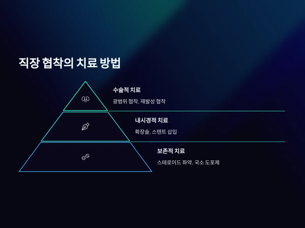 → 아닙니다. 초기 협착은 보존적 치료나 간단한 내시경적 확장술로 해결 가능한 경우가 많으며, 수술은 최후의 수단입니다.