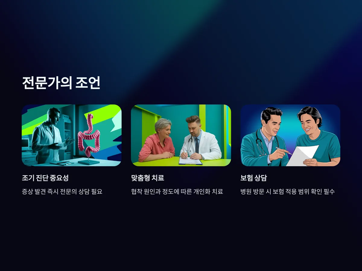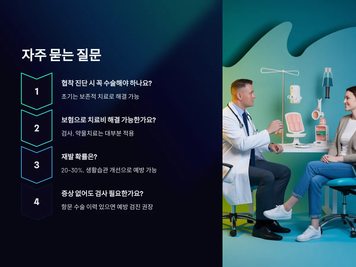 특히 치질이나 항문질환 수술 경험이 있다면 6개월마다 정기검진을 통해 협착 여부를 체크하는 것이 중요합니다. 고위험군일수록 예방적 관리를 강화하는 것이 중증으로 진행되는 것을 막을 수 있습니다.