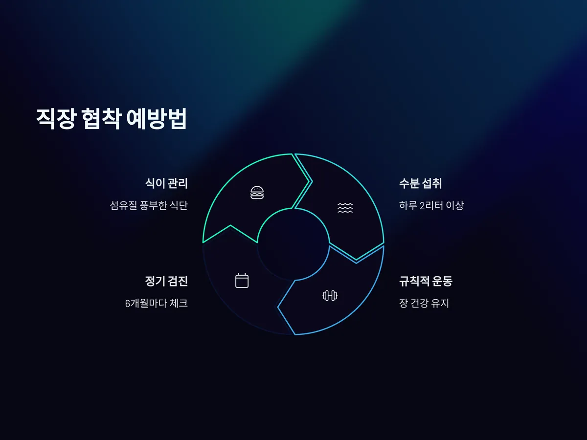 섬유질이 풍부한 식단, 하루 2리터 이상의 수분 섭취, 규칙적인 운동은 장 건강을 유지하는 데 필수적입니다. 또한 항문에 반복적인 자극을 주는 항문 성교, 과도한 항문 세정제 사용도 협착의 원인이 될 수 있으므로 주의가 필요합니다.