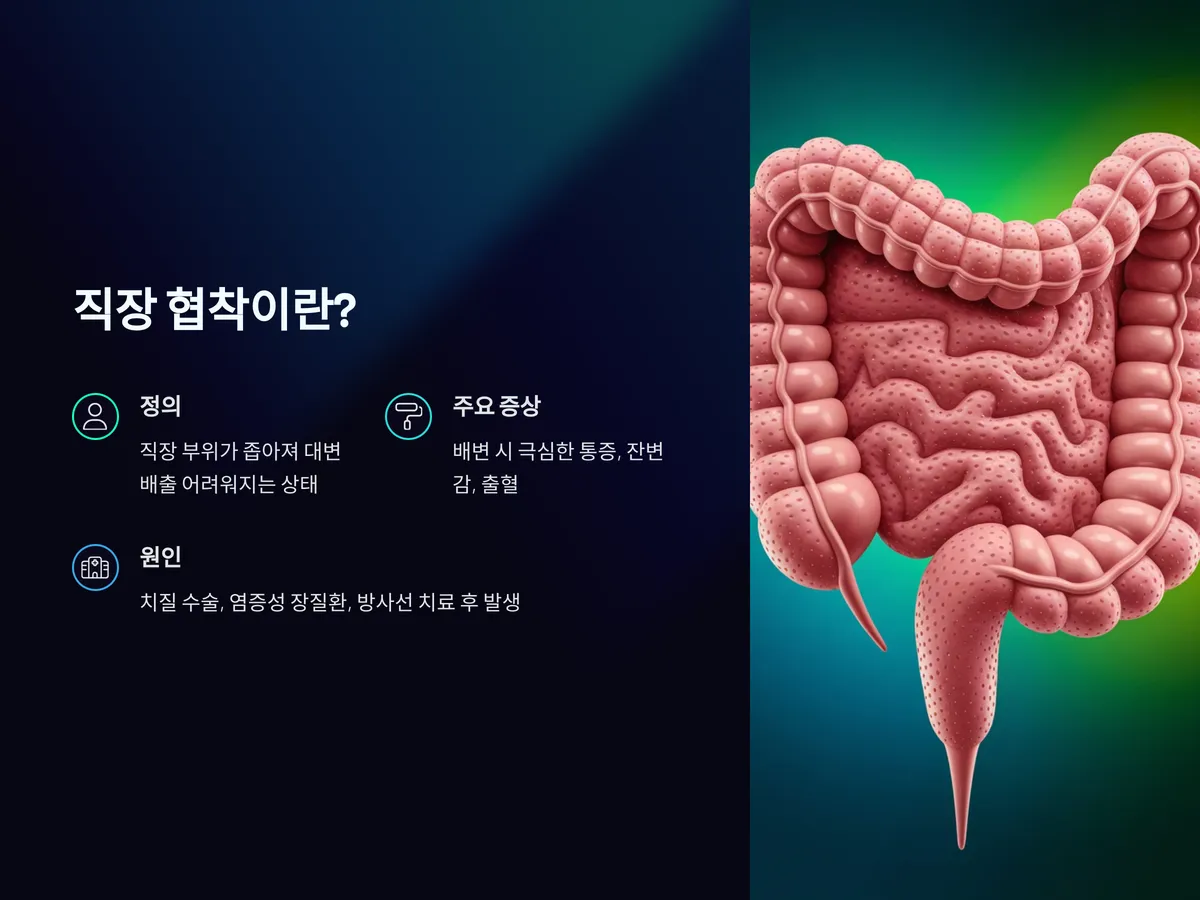 직장 협착(rectal stricture)이란 직장 부위가 염증, 외상, 수술 후 유착 등으로 인해 좁아지면서 대변 배출이 어려워지는 상태를 말합니다. 주요 증상으로는 배변 시 극심한 통증, 지속적인 잔변감, 출혈 등이 있으며, 심할 경우 소장이나 대장의 일부가 막히는 장폐색으로 이어질 수 있습니다.
