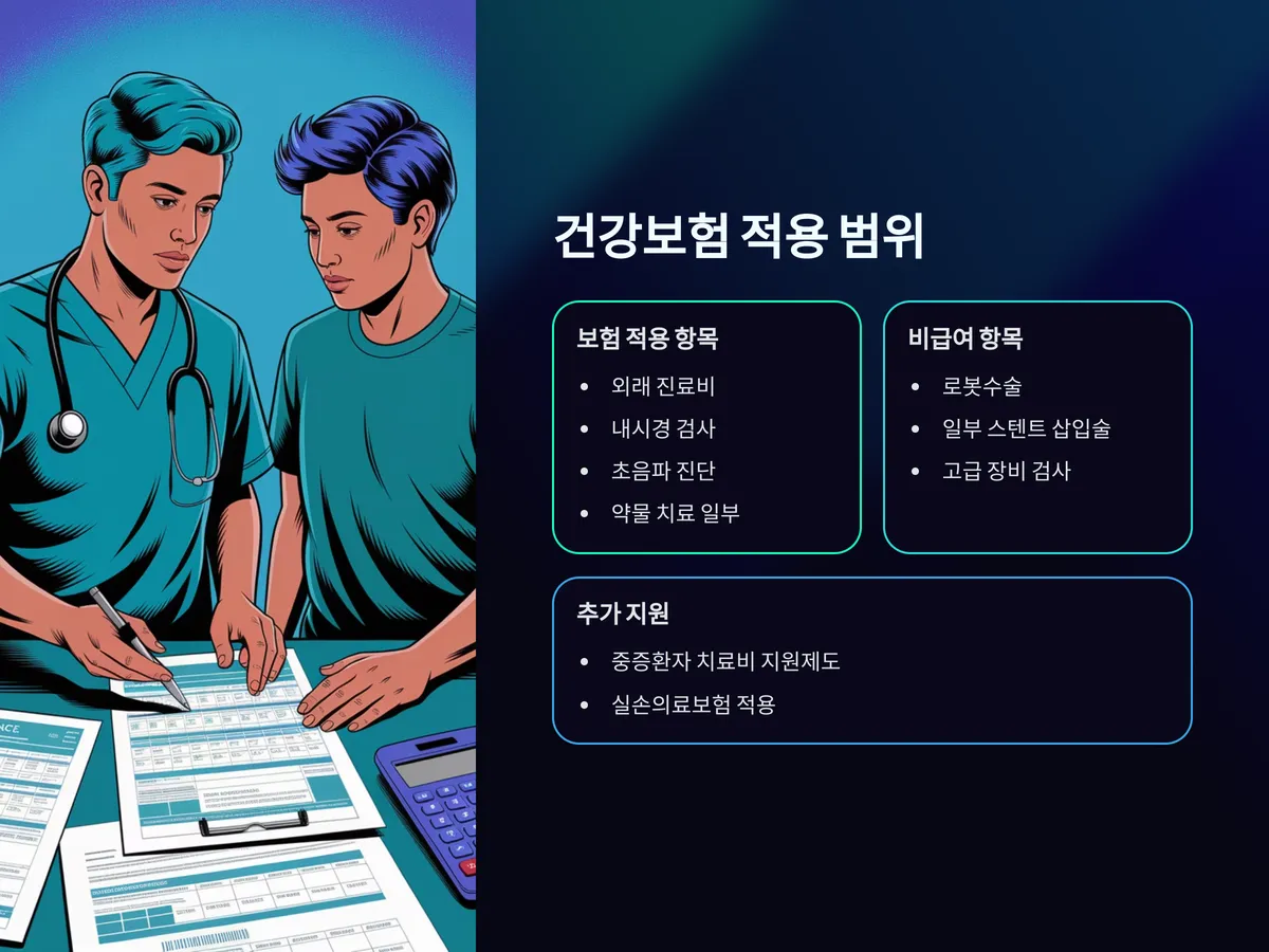 → 검사나 약물 치료는 대부분 건강보험 적용이 가능하지만, 고급 장비를 동원한 검사나 로봇수술은 실손보험과 병행 확인이 필요합니다.