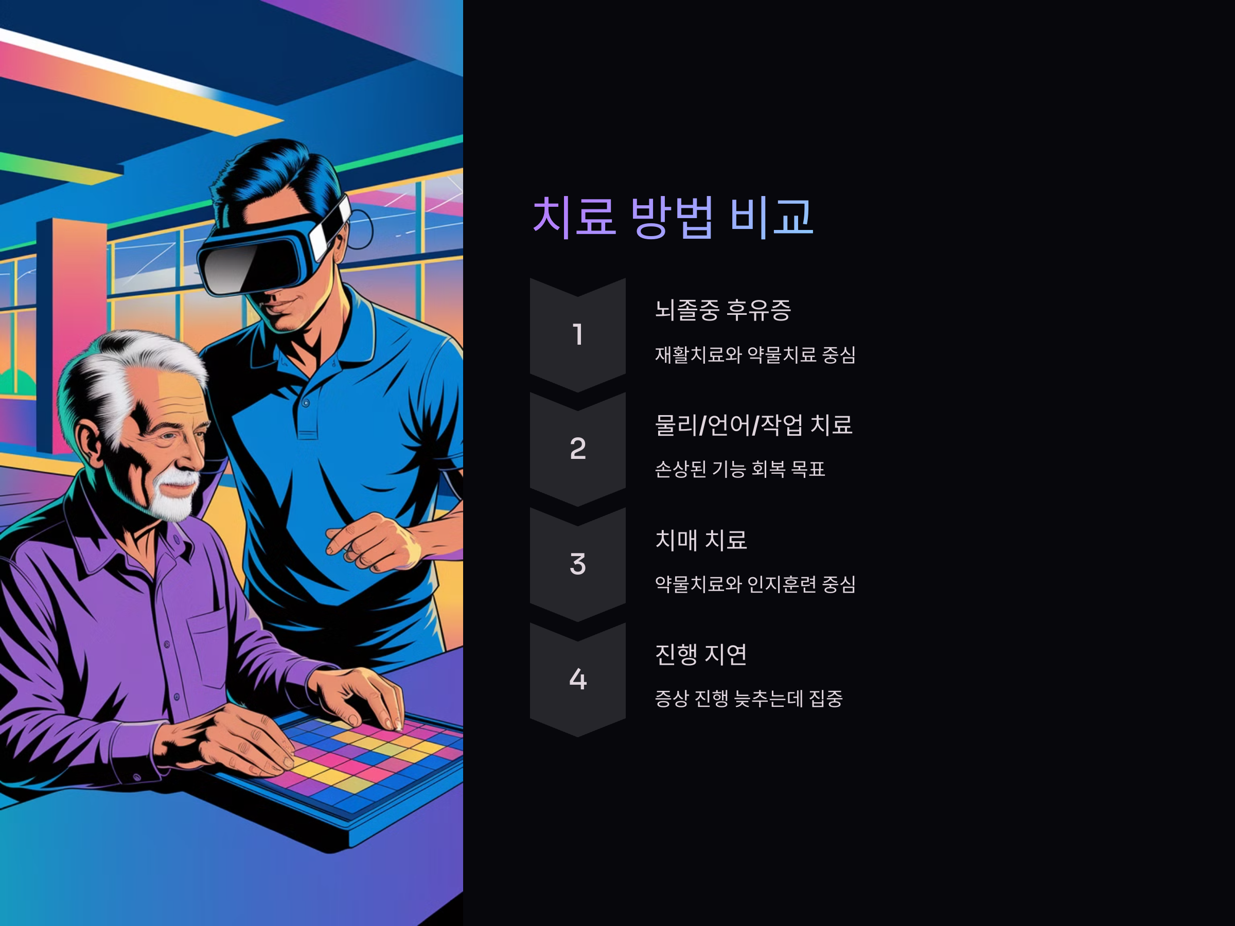 뇌졸중 후유증과 치매 초기 증상은 치료 방법이 다릅니다. 뇌졸중 후유증의 경우, 재활치료와 약물치료가 중요한 역할을 합니다. 뇌졸중 후유증을 겪고 있는 환자는 신경과학자와 협력하여 재활치료를 진행하고, 필요에 따라 약물치료를 통해 증상의 개선을 도울 수 있습니다. 특히, 뇌졸중 환자에게는 물리치료나 언어치료, 작업치료가 중요한 치료 방법으로 포함됩니다.