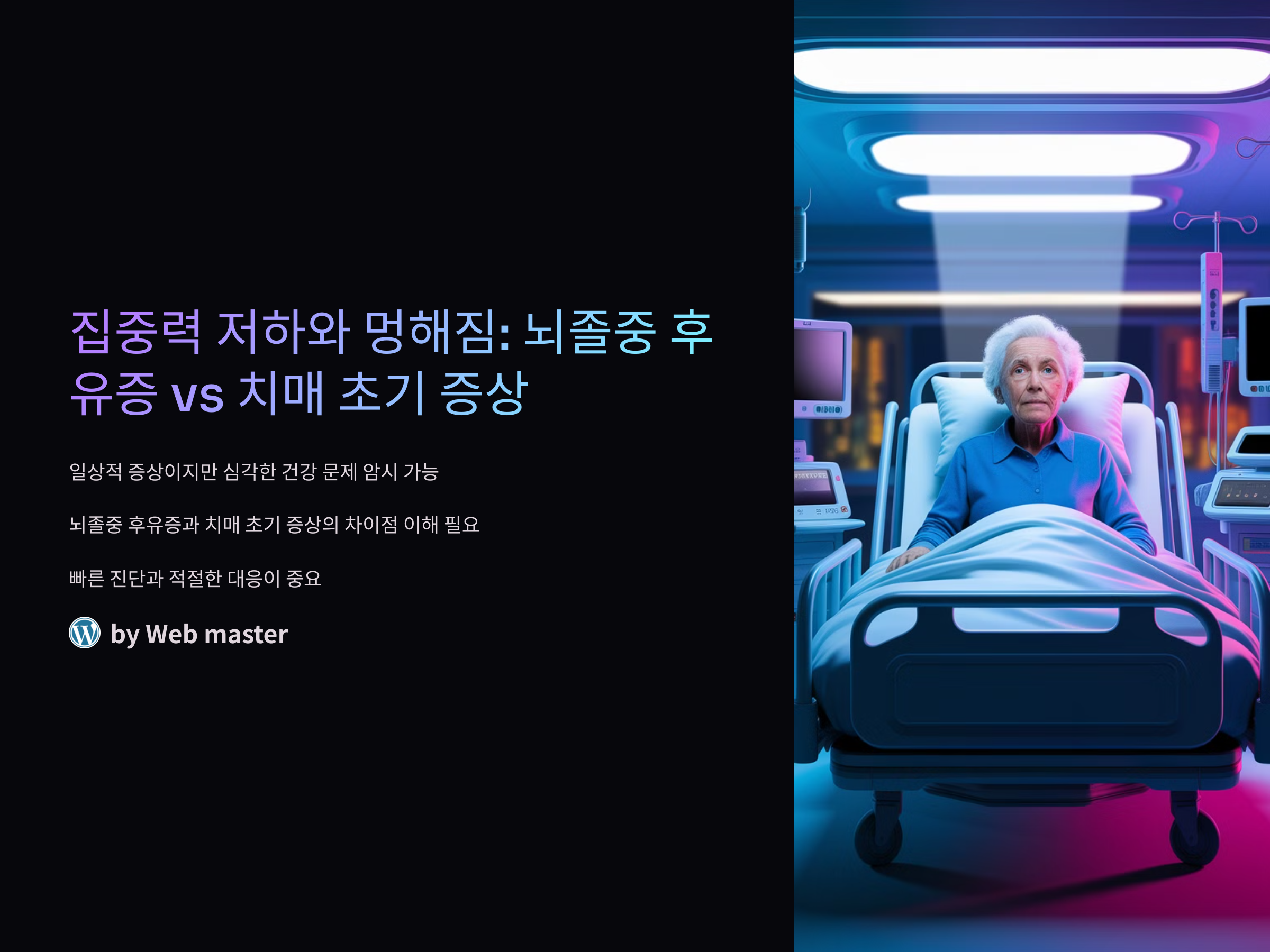 집중력이 떨어지고 멍해지는 증상은 일상에서 자주 경험할 수 있는 문제입니다. 하지만 이 증상이 뇌졸중 후유증이나 치매 초기 증상일 수 있다는 사실을 알면, 건강 상태를 점검할 필요성이 커집니다. 특히 뇌졸중 후유증과 치매 초기 증상은 서로 비슷한 부분이 있지만, 그 원인과 진행 상황에서 큰 차이가 있습니다. 본 글에서는 두 질환의 주요 차이점과 증상, 그리고 적절한 대응 방법에 대해 알아보겠습니다.